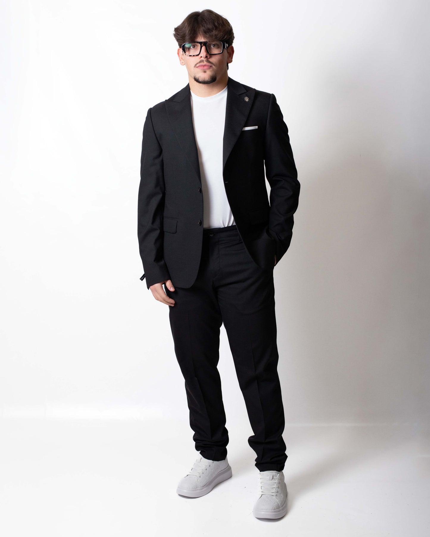 Abito Daniele Alessandrini disponibile in due varianti. Giacca con design monopetto, texture in misto lana, collo reverse, maniche lunghe, chiusura frontale con bottoni, tasche frontali, tasca sul petto, spacchi sul retro, bottoni sui polsini e spilla logata sul collo. Pantalone modello chino, con texture misto lana, passanti in vita per cintura, chiusura frontale con bottone e zip, tasche laterali e tasche sul retro con bottoni.