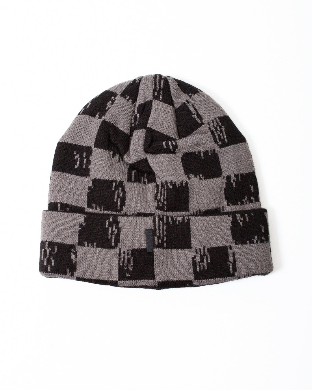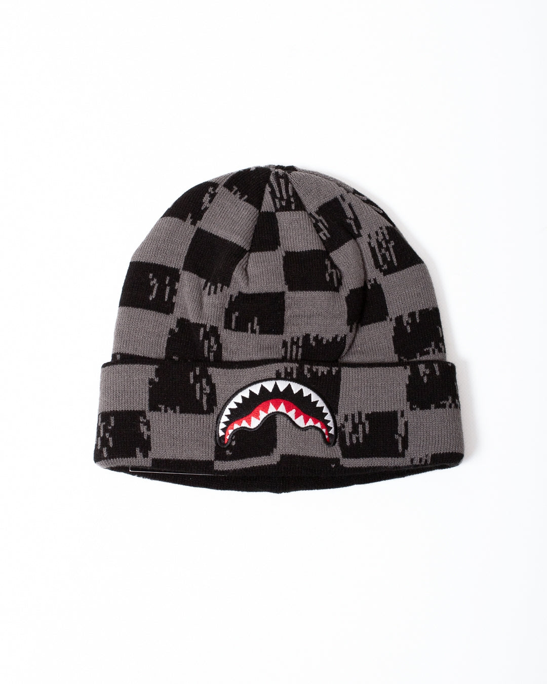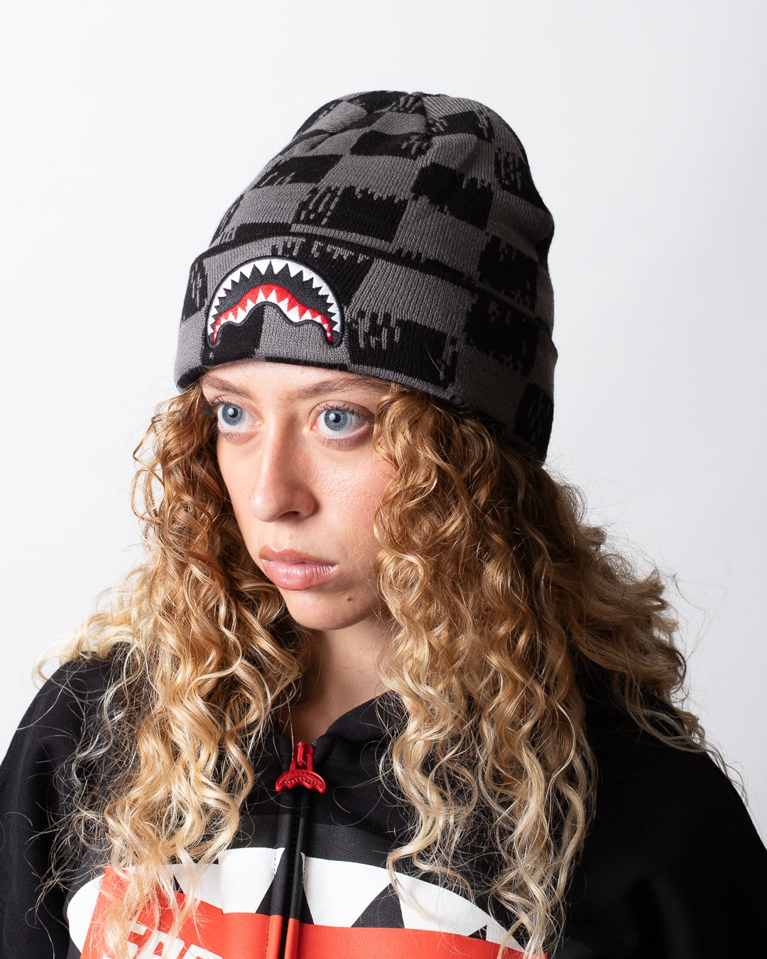 Berretto Sprayground grigio, unica variante, con fantasia a quadri applicata all-over e logo ricamato frontalmente.