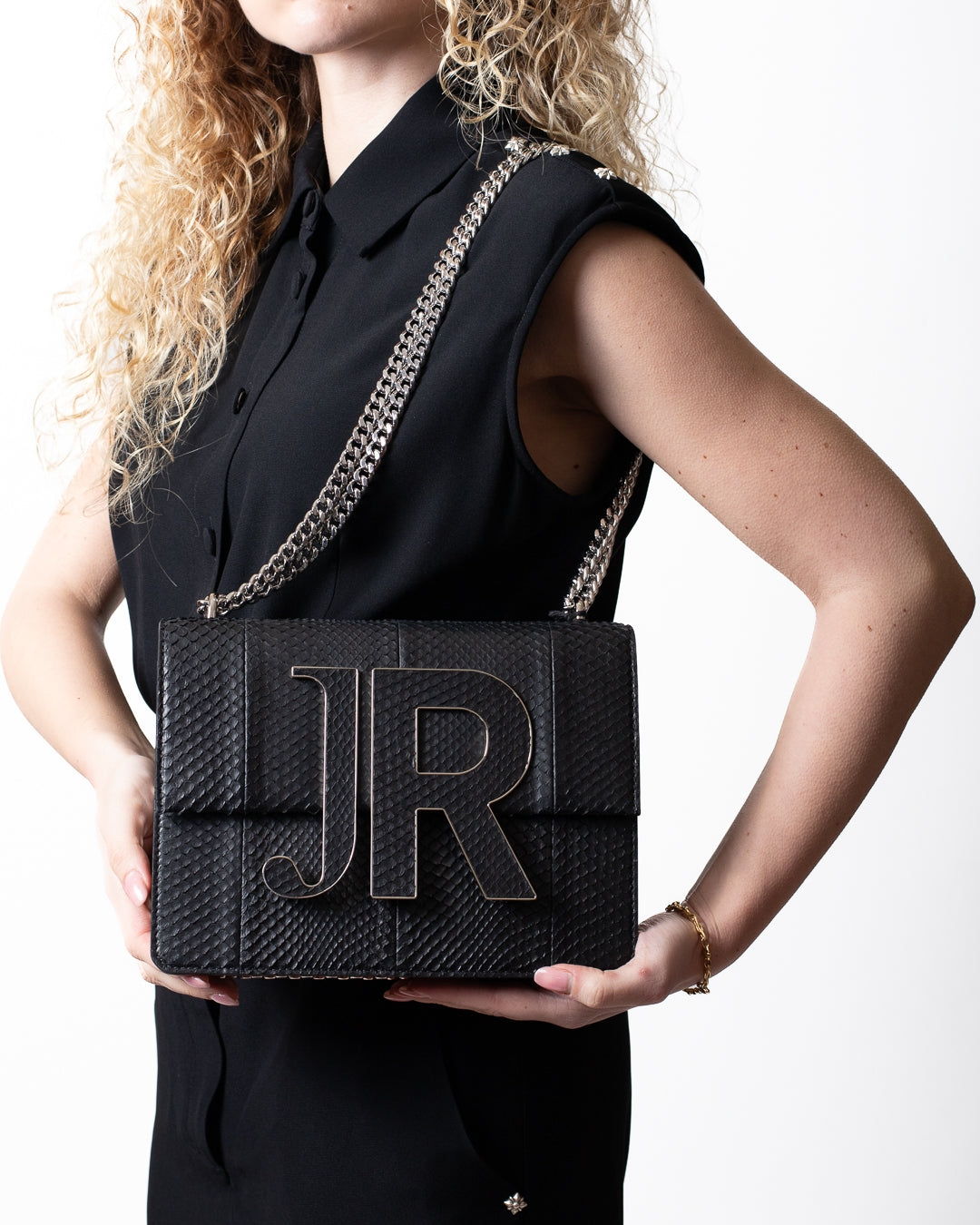 Borsa John Richmond nera, unica variante. Design in vera pelle, tracolla in catena, chiusura frontale con bottoni magnetici, borchie applicate lateralmente e sul fondo, effetto pitonato applicato all-over, logo stampato sul retro, maxi placca logata JR in metallo applicata frontalmente e tre scomparti interni.