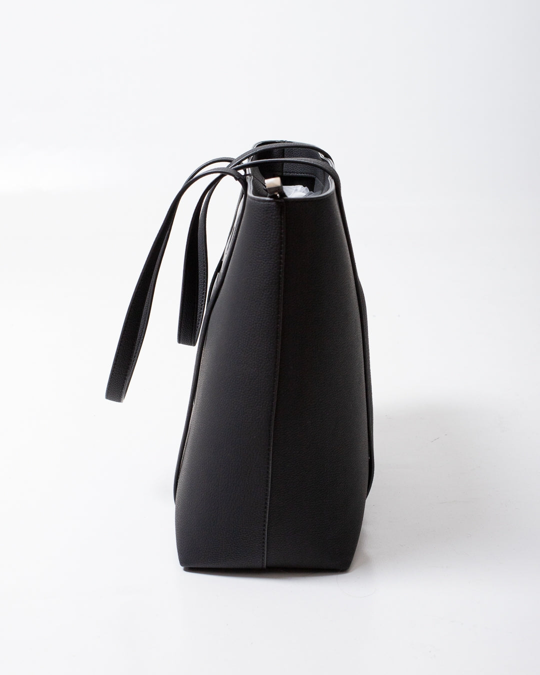 Borsa John Richmond nera, unica variante. Design in ecopelle, chiusura superiore con zip, manici superiori, logo patch applicato frontalmente e sul retro e placchetta in metallo logata applicata frontalmente. Internamente: unico scomparto.