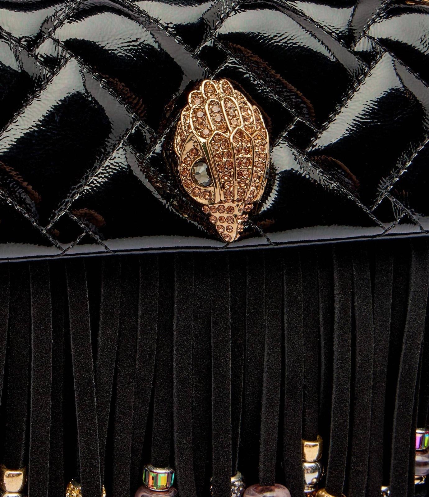 Borsa Kurt Geiger nera, unica variante. Design in pelle, doppia tracolla in catena con imbottitura in pelle, chiusura frontale con bottoni magnetici, placchetta in metallo logata applicata sul retro, frange in camoscio con perline applicate sul davanti e testa d'aquila in ottone con cristalli applicata sul davanti. Internamente: doppio scomparto, tasca a soffietto e fodera logata jacquard.