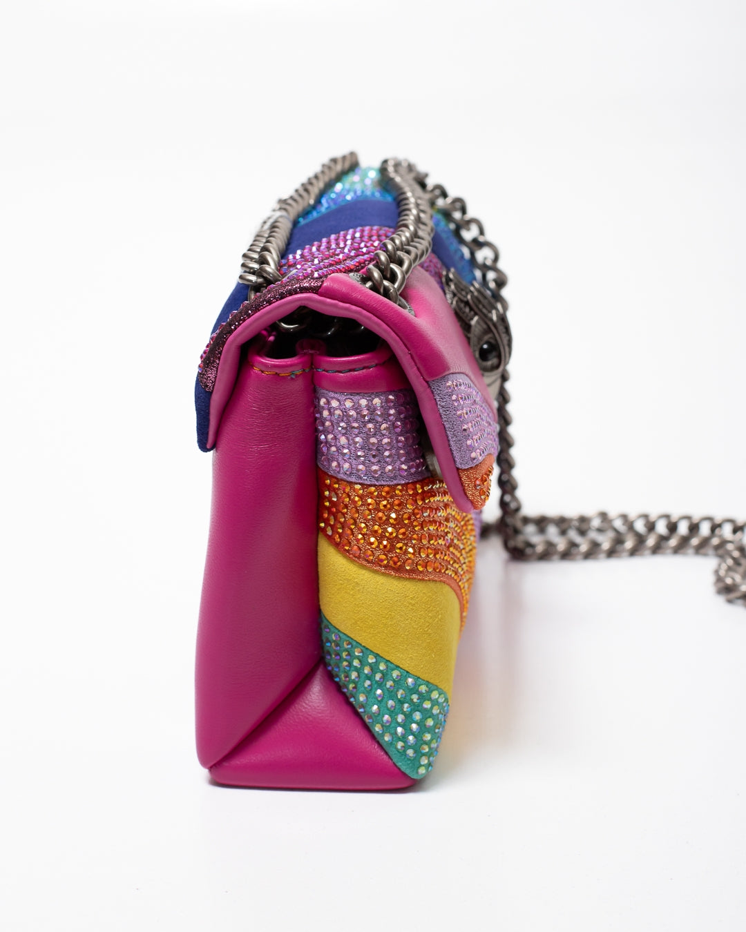 Borsa Kurt Geiger multicolore, unica variante. Dettagli in suede, texture in pelle, chiusura frontale con bottoni magnetici, doppia tracolla in metallo, logo stampato sul retro, strass applicati frontalmente e testa d'aquila in ottone con cristalli e perline applicata sul davanti. Internamente: tasca a soffietto e fodera logata jacquard.