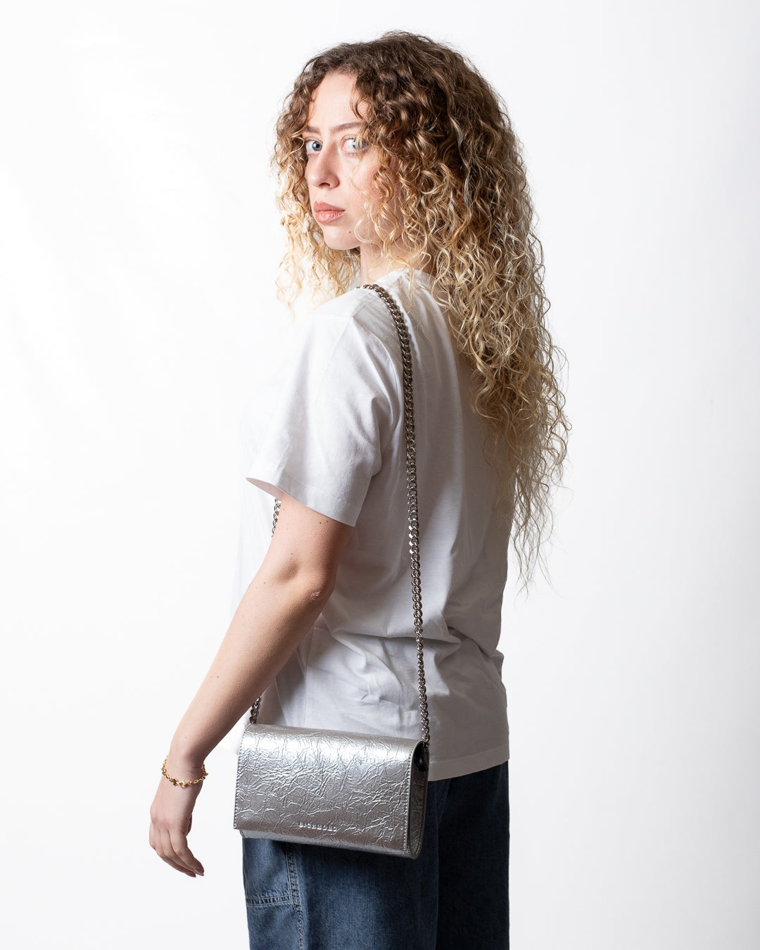 Borsa Richmond silver, unica variante. Design in pelle, tracolla in catena, chiusura frontale con bottone magnetico e logo inciso frontalmente. Internamente: unico scomparto, tasca a soffietto e fodera logata jacquard.