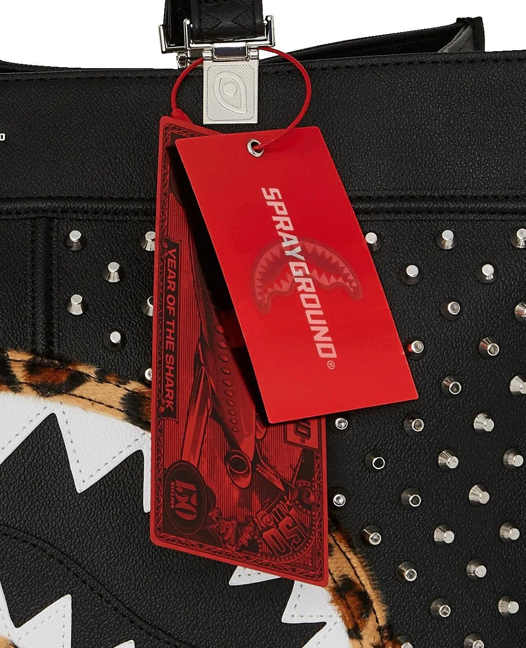 Borsa Sprayground nero, rappresenta la grafica " cheetah punk tortuga tote "caratterizzata da dettagli e applicazioni. Realizzato in eco-pelle resistente e durevole presenta apertura magnetica, doppio manico rigido superiore e tracolla regolabile per taglie personalizzate.