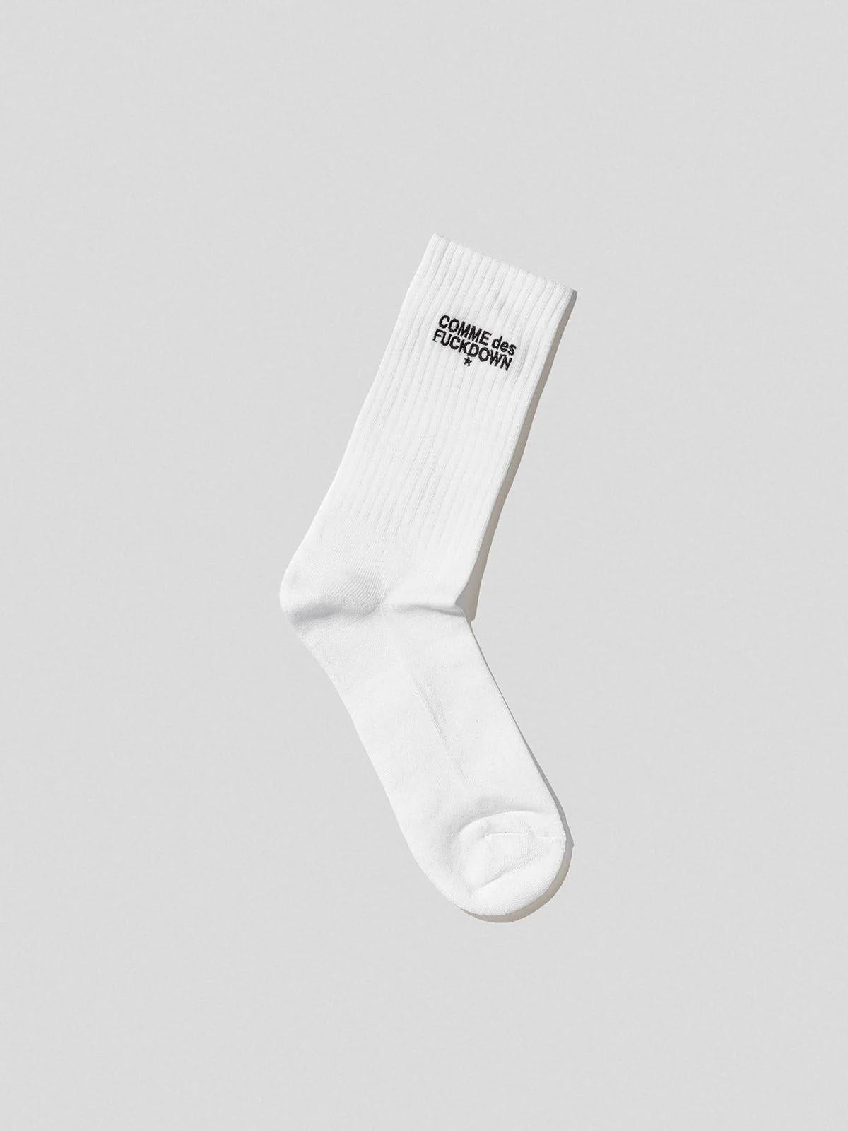 Calze Comme des Fuckdown bianche, unica variante. Design in spugna, costine applicate sulla parte superiore e logo ricamato a contrasto lateralmente.