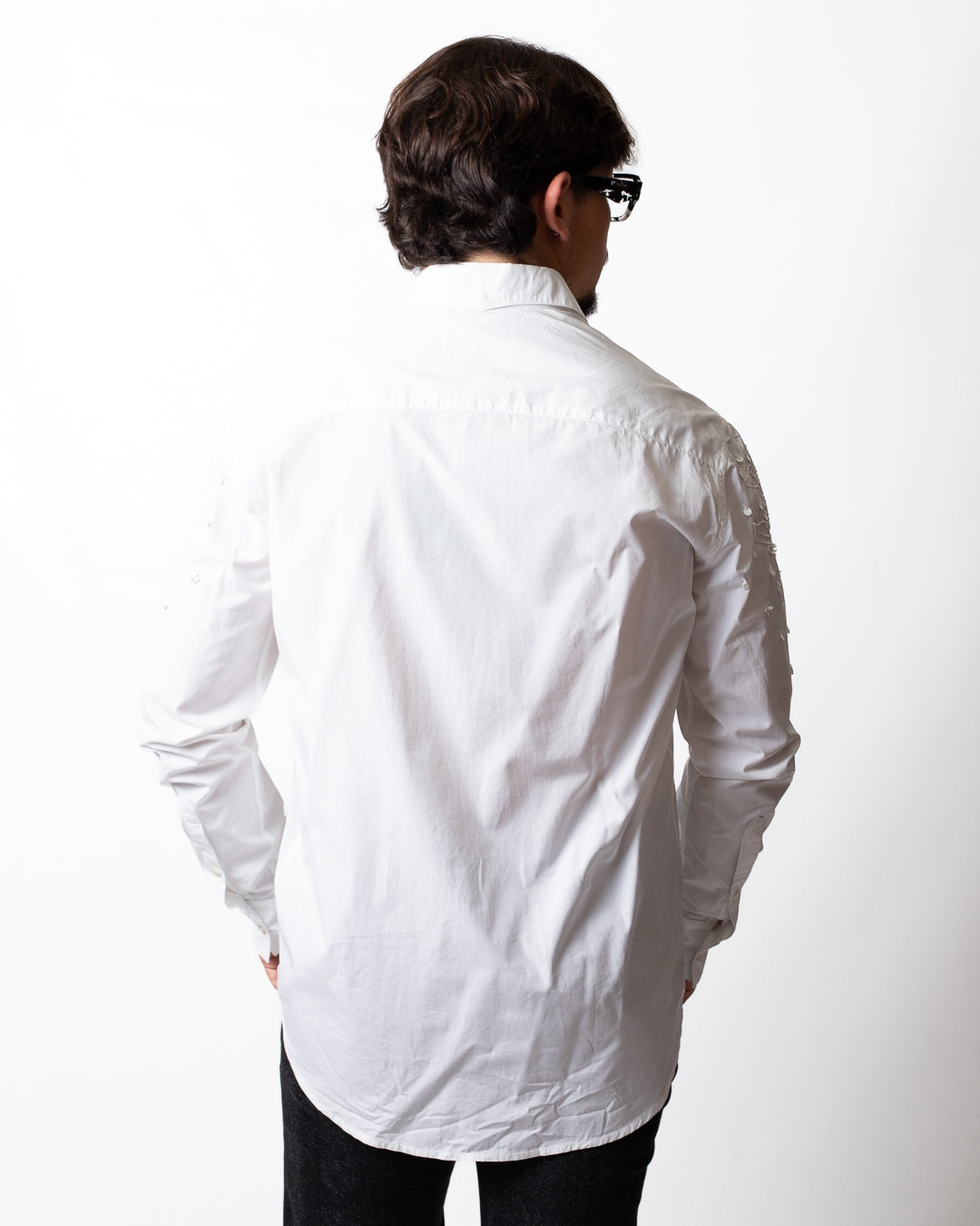 Camicia John Richmond bianca, unica variante. Colletto a punta, maniche lunghe, chiusura frontale con bottoni, bottoni sui polsini, fondo tondo e ricami e paillettes applicati tono su tono frontalmente.