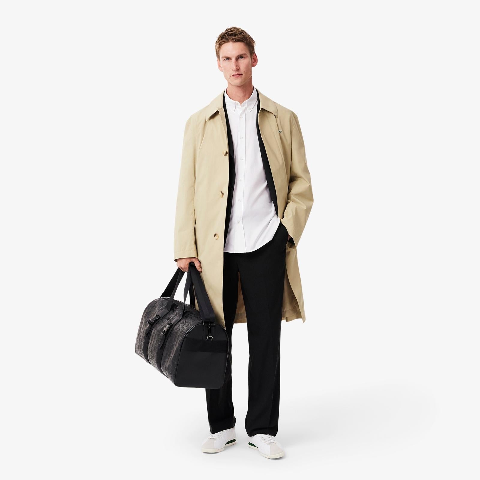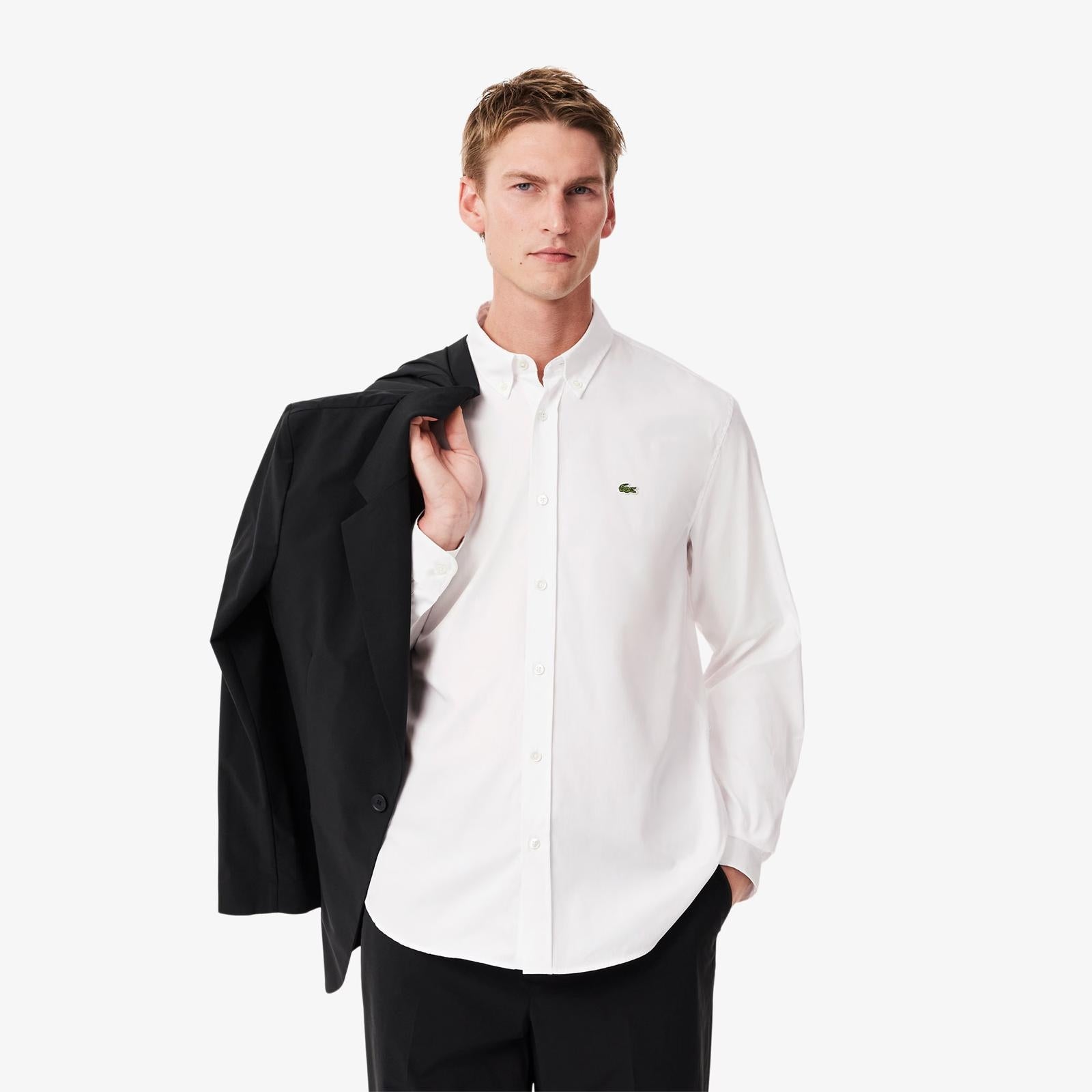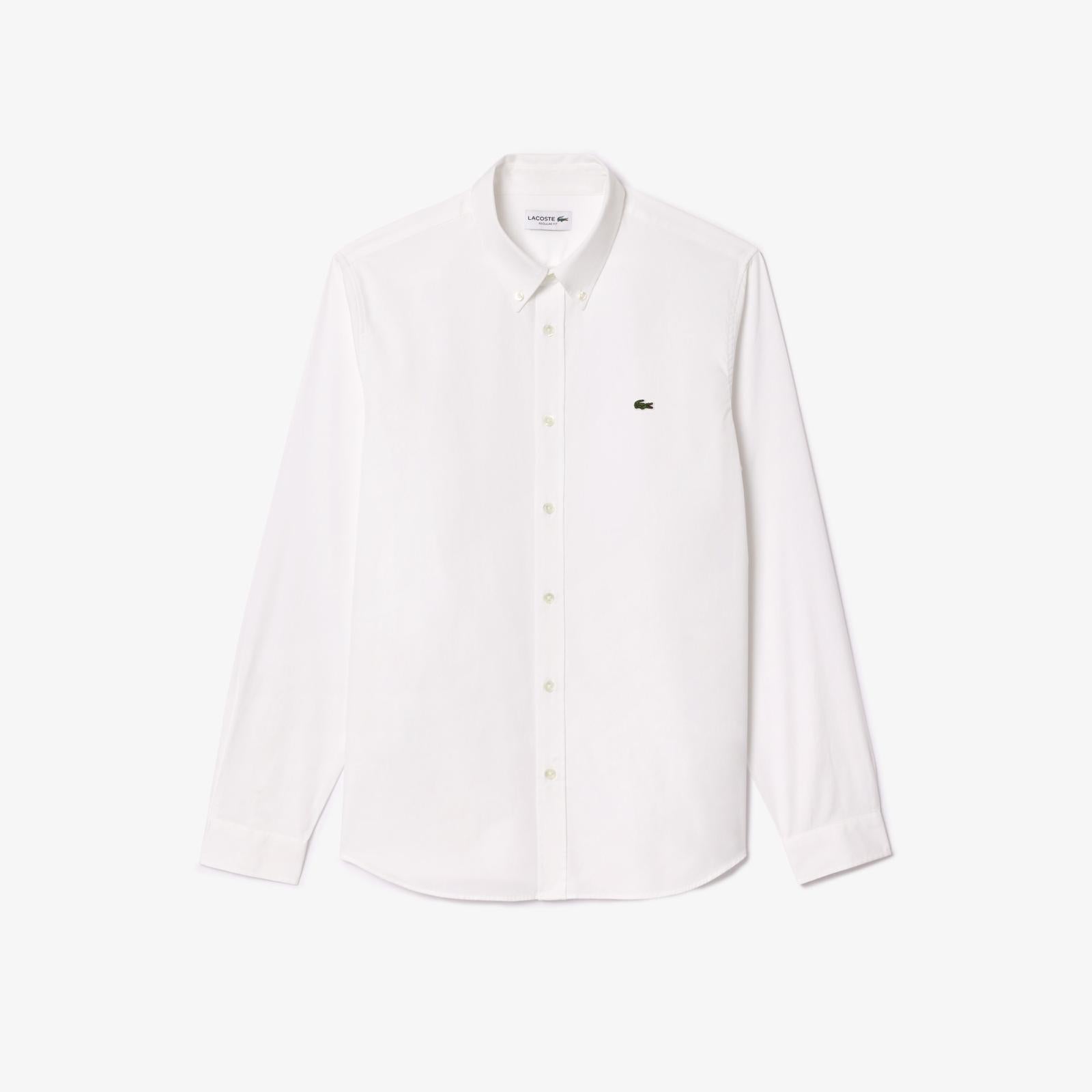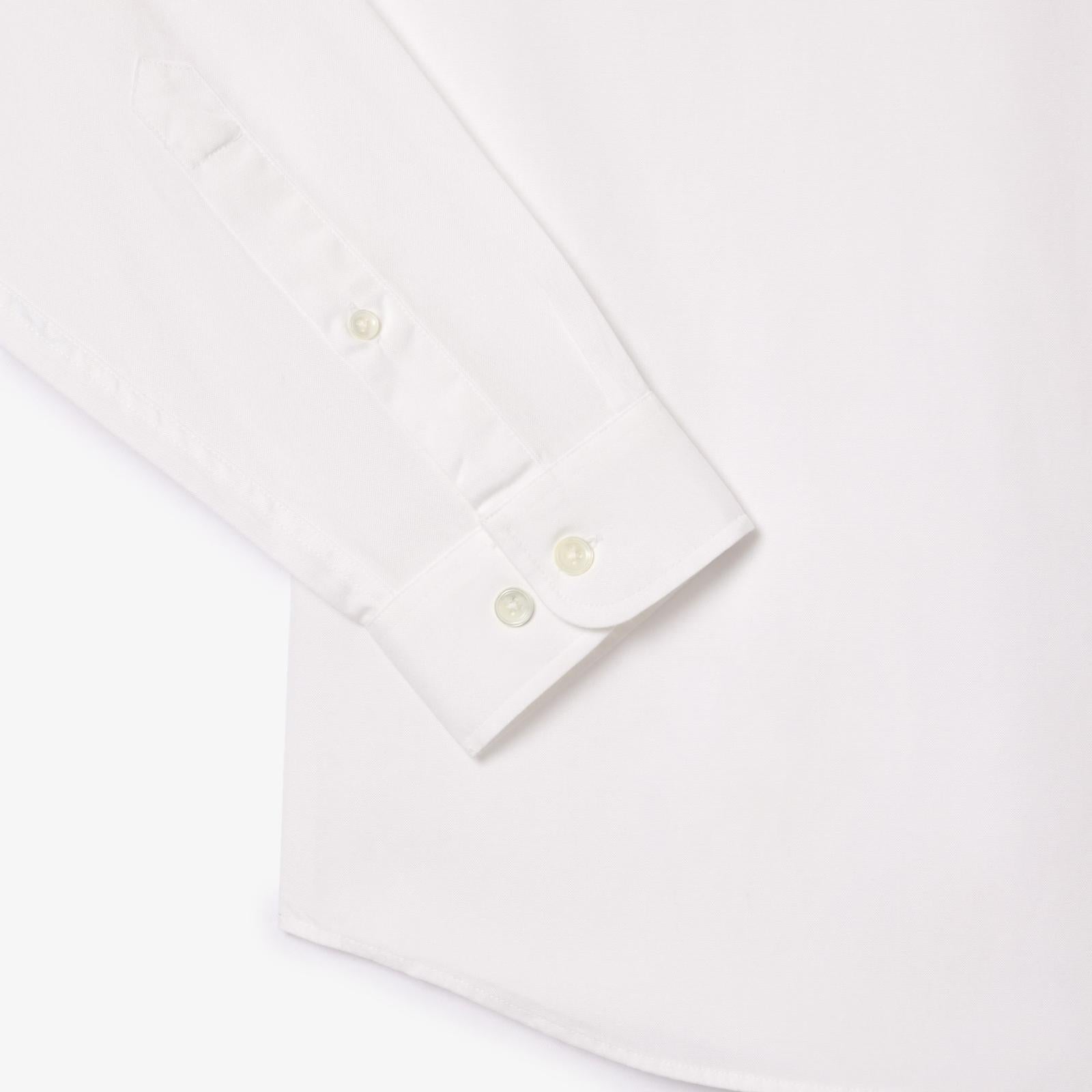 Camicia Lacoste bianca, unica variante. Vestibilità regular, colletto a punta, maniche lunghe, chiusura frontale con bottoni, polsini con bottoni e logo coccodrillo applicato sul petto.