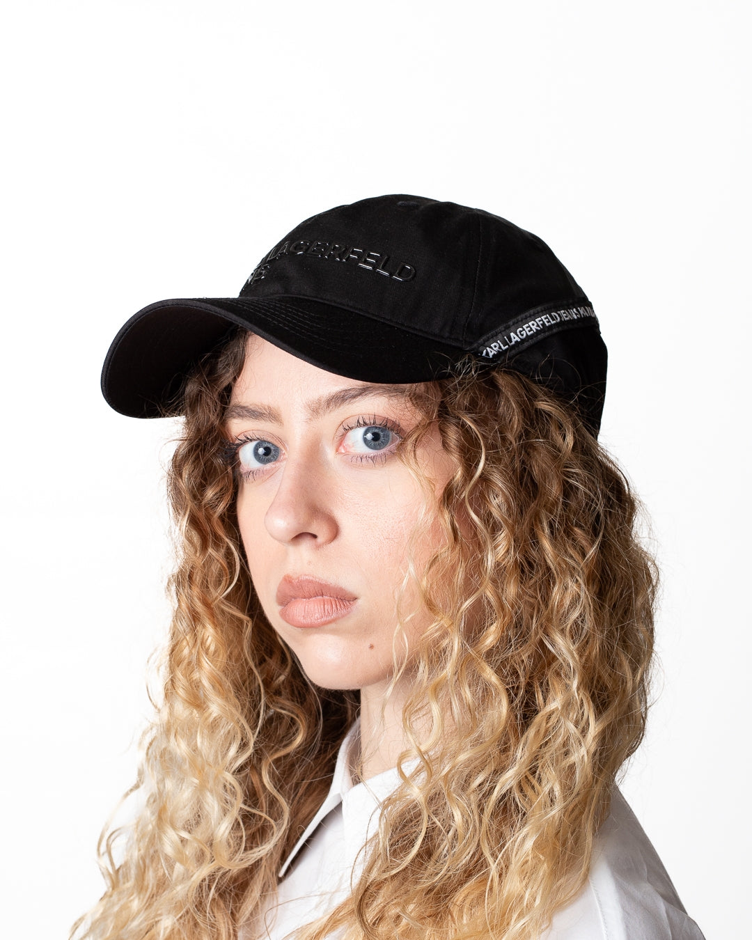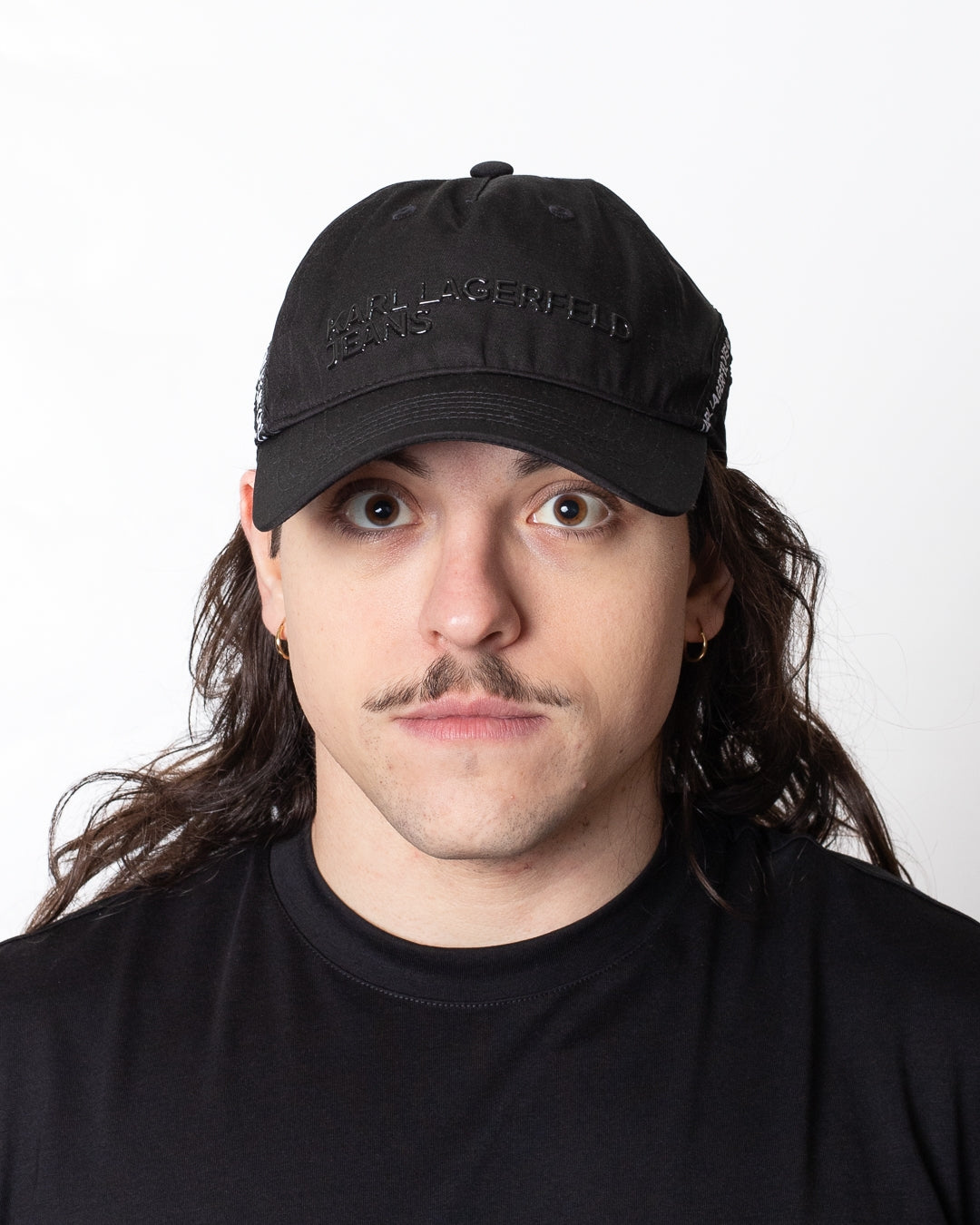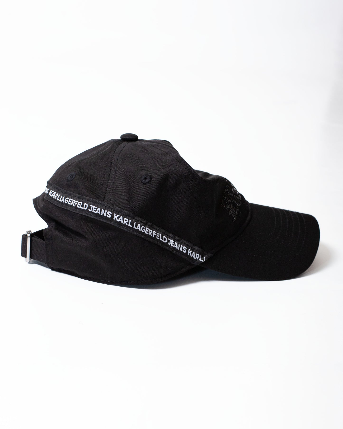 Cappello Karl Lagerfeld Jeans nero, unica variante. Design con visiera, cinturino regolabile sul retro, fascia con logo all-over e logo in gomma applicato tono su tono sul davanti.