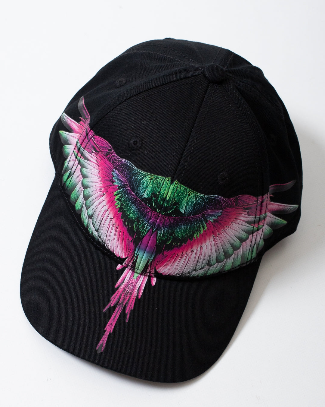 Cappello Marcelo Burlon nero/rosa, unica variante. Visiera, cinturino regolabile sul retro, logo ricamato sul retro tono su tono e stampa "Wings Colorfull Pink" applicata frontalmente.