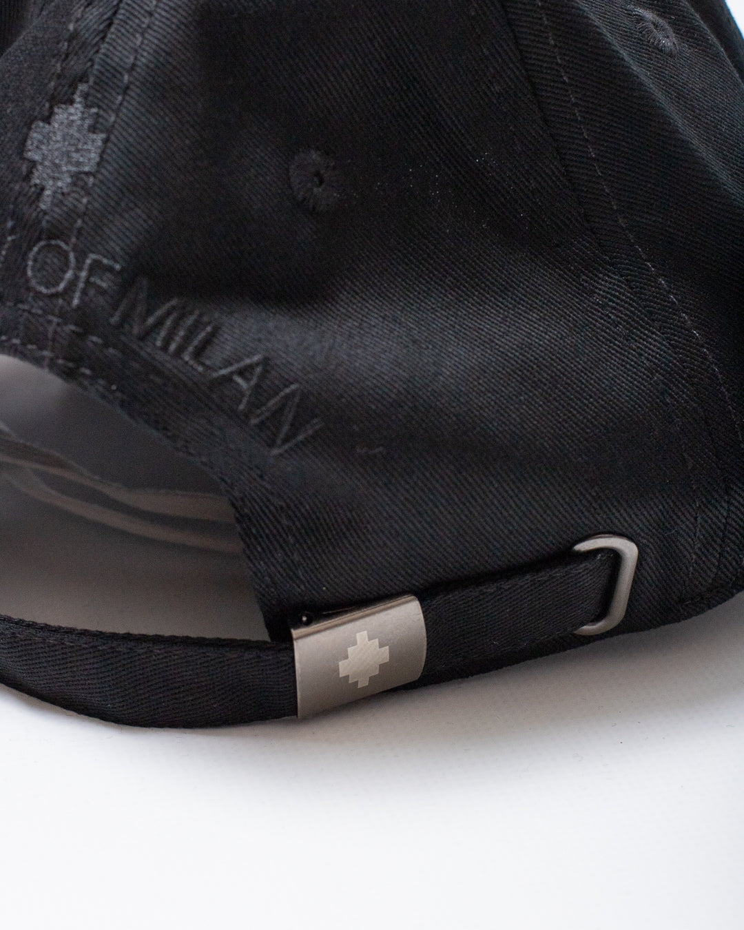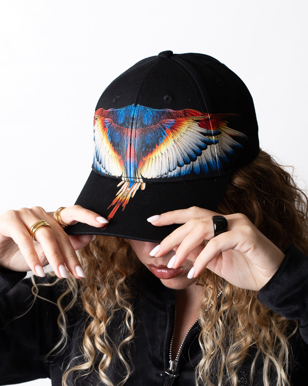 Cappello Marcelo Burlon nero/giallo, unica variante. Visiera, cinturino regolabile sul retro, logo ricamato sul retro tono su tono e stampa "Wings Colorfull Yellow" applicata frontalmente.