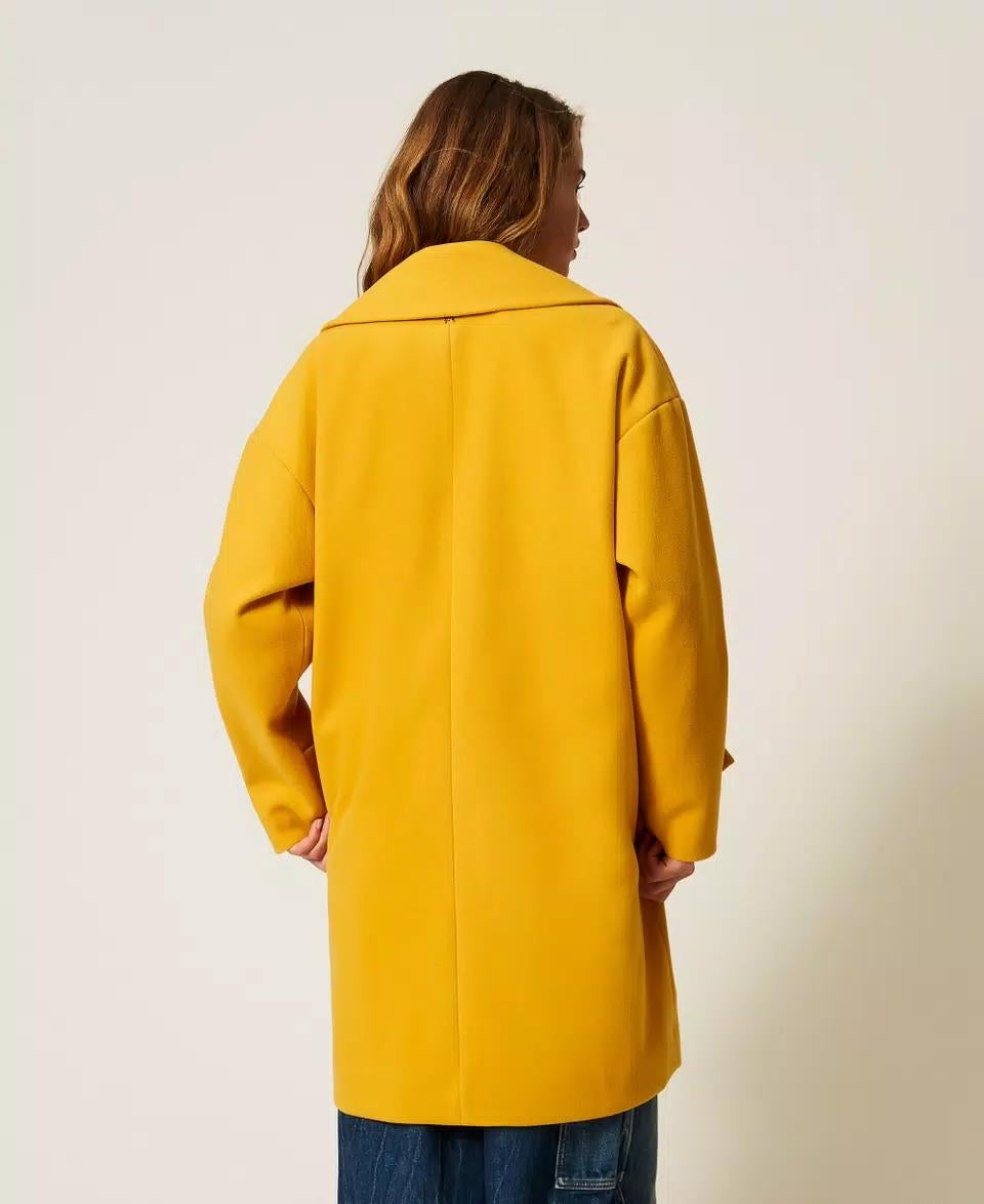 Cappotto Twinset Actitude mango, unica variante. Design doppiopetto, collo reverse, maniche lunghe, chiusura frontale con bottoni, tasche laterali, bottoni sui polsini e placchetta logata applicata sul retro.