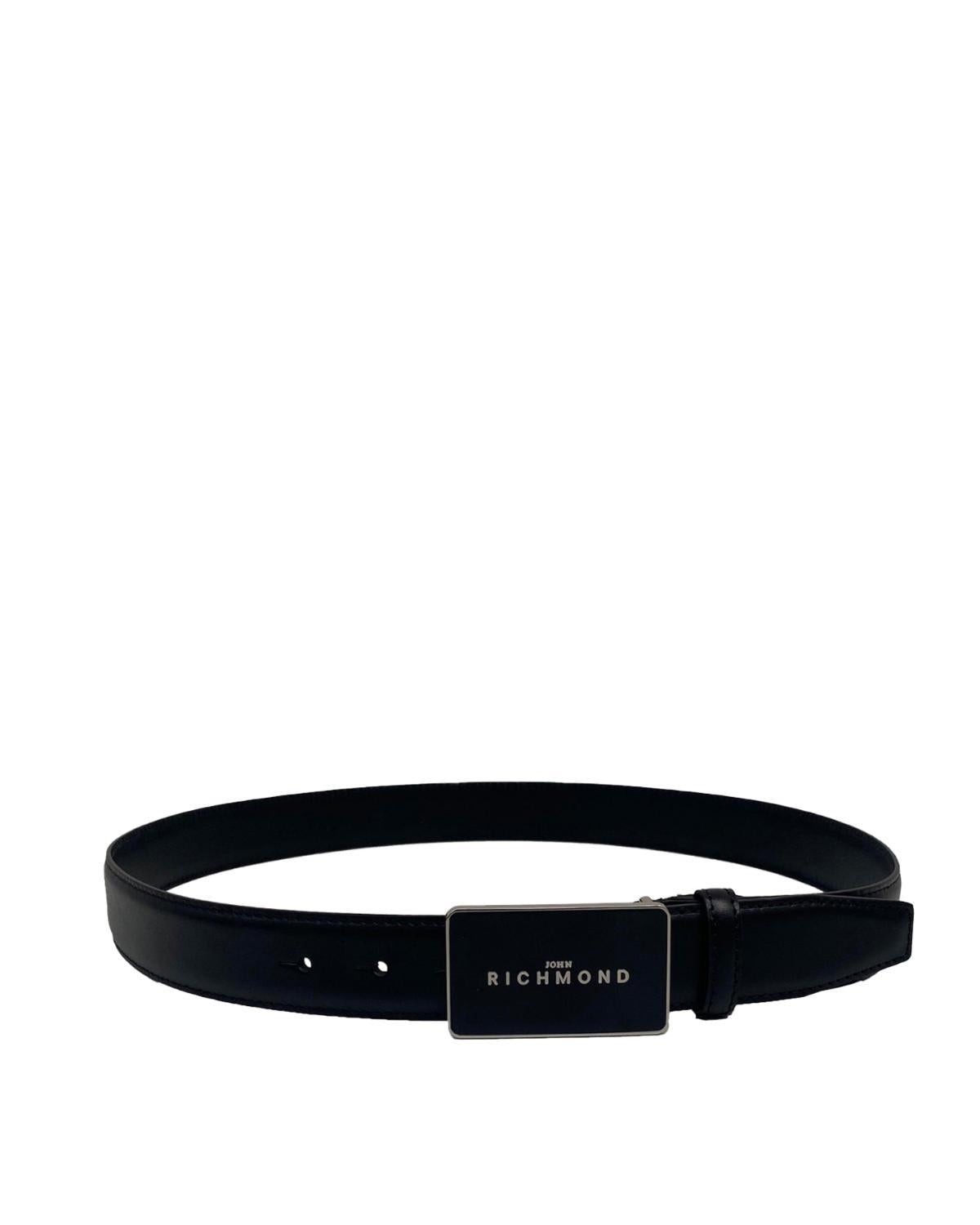 Cintura John Richmond nera, unica variante. Design in pelle, cinturino regolabile e placca in metallo logata applicata frontalmente.