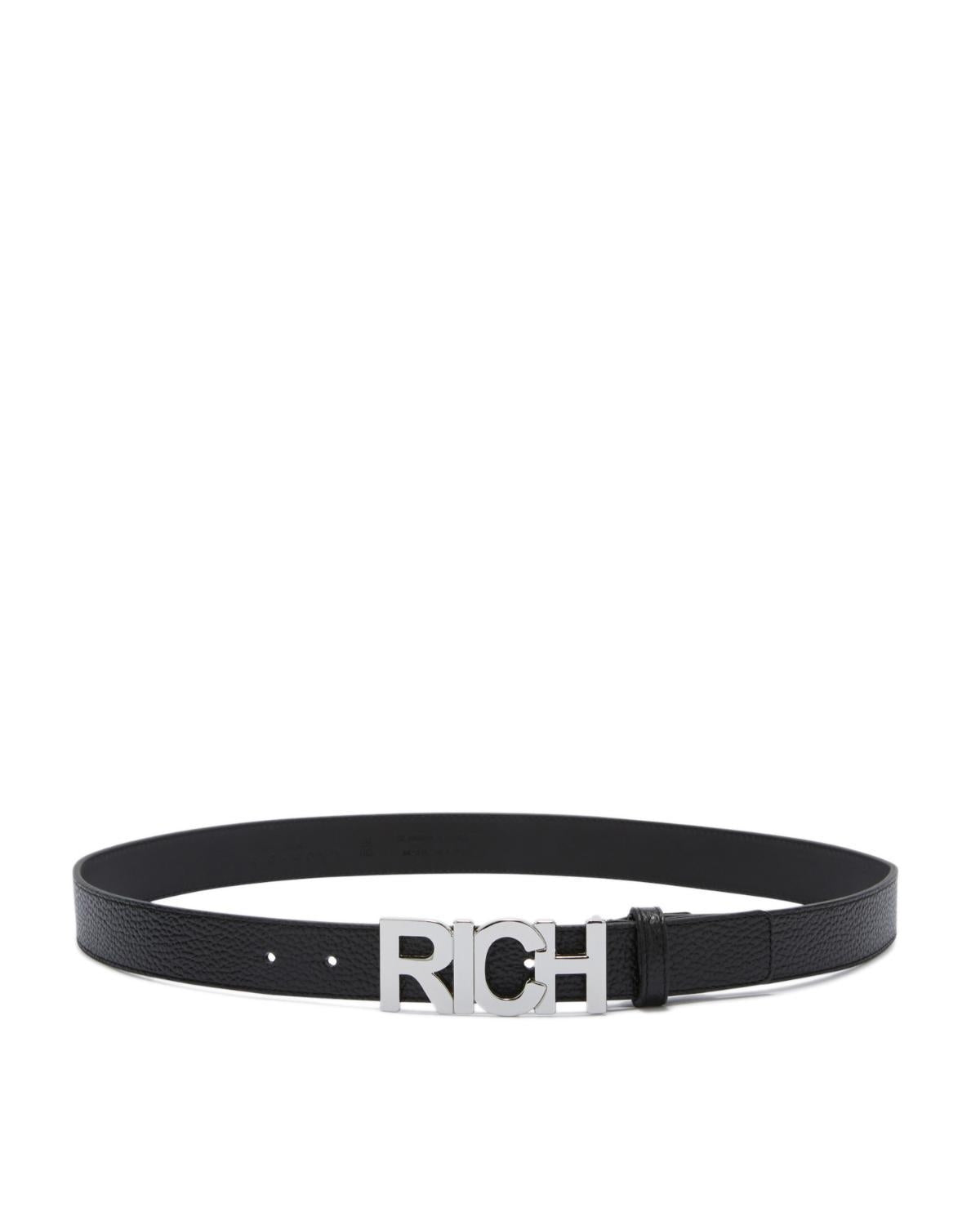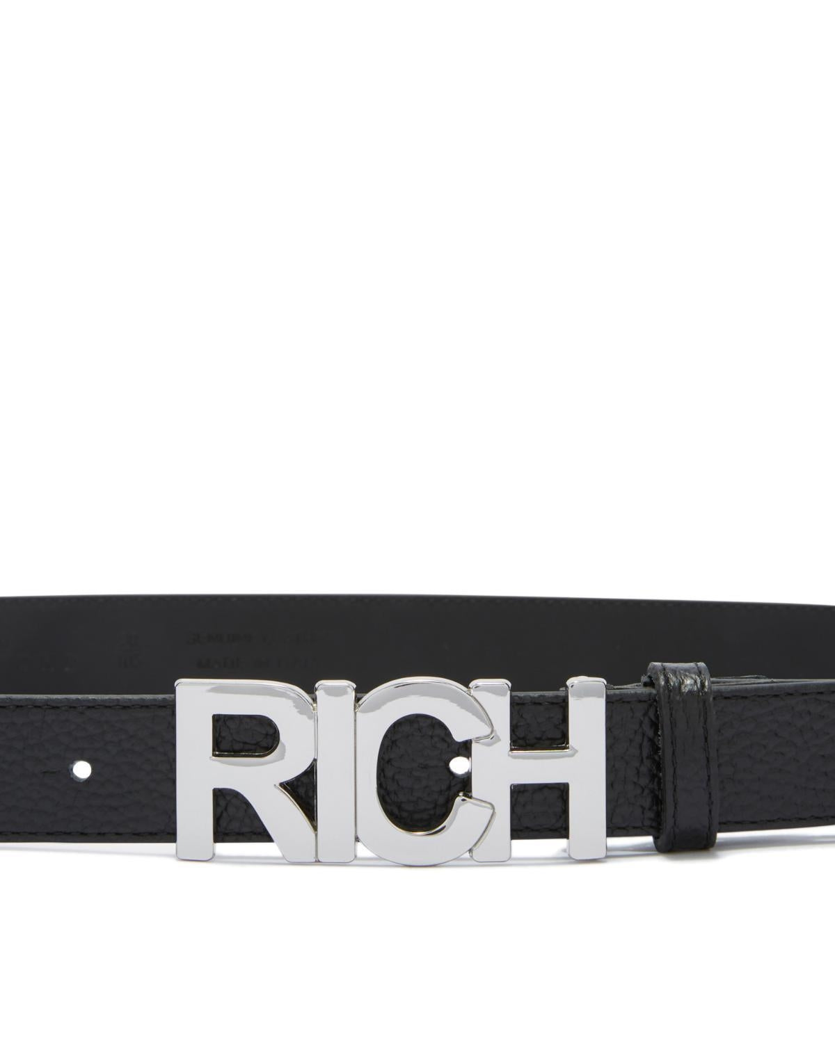 Cintura John Richmond nera, unica variante. Design in pelle, cinturino regolabile e placca RICH in metallo applicata frontalmente.