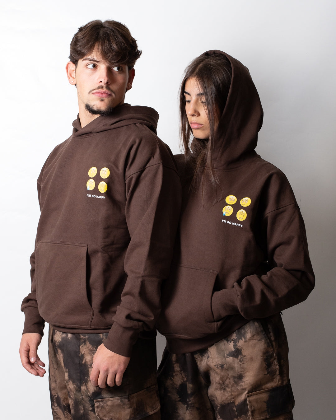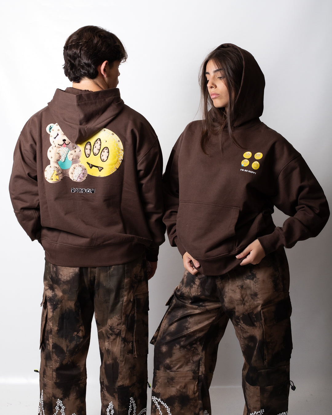 Felpa Barrow marrone, unica variante. Cappuccio, maniche lunghe, polsini e fondo elasticizzati, tasca marsupio frontale, stampa "Emoji" applicata sul petto e stampa logata con strass e perline applicata sulla schiena.