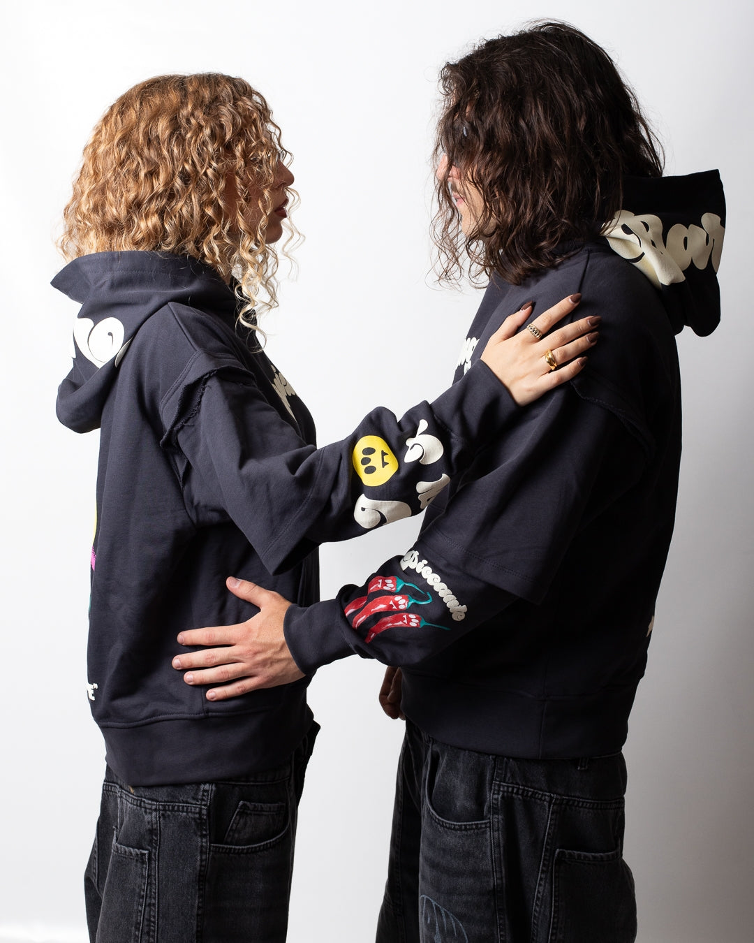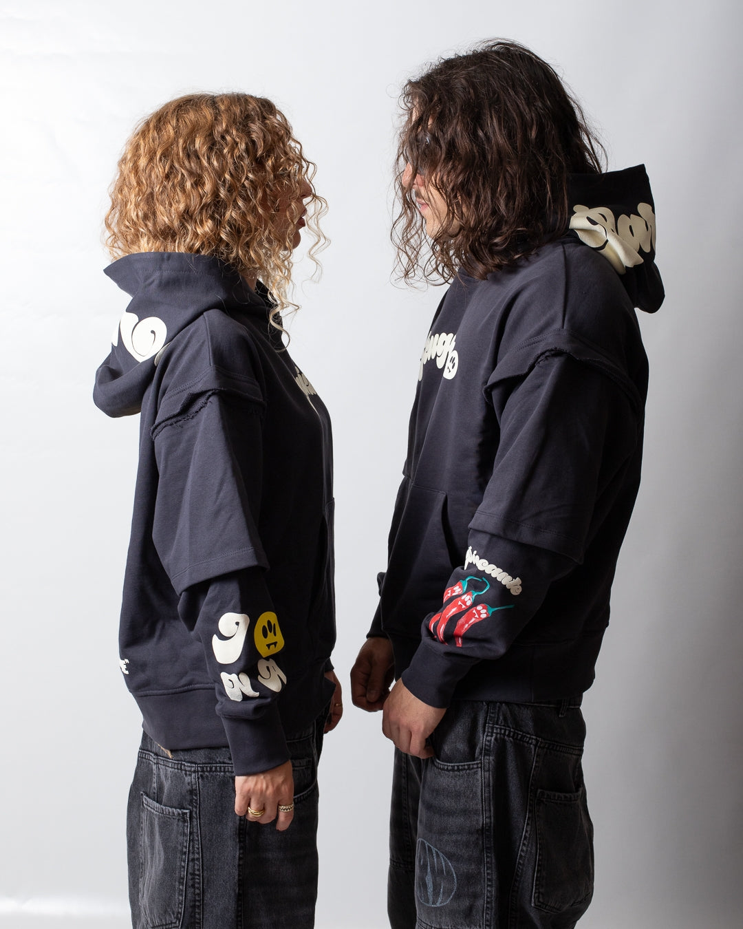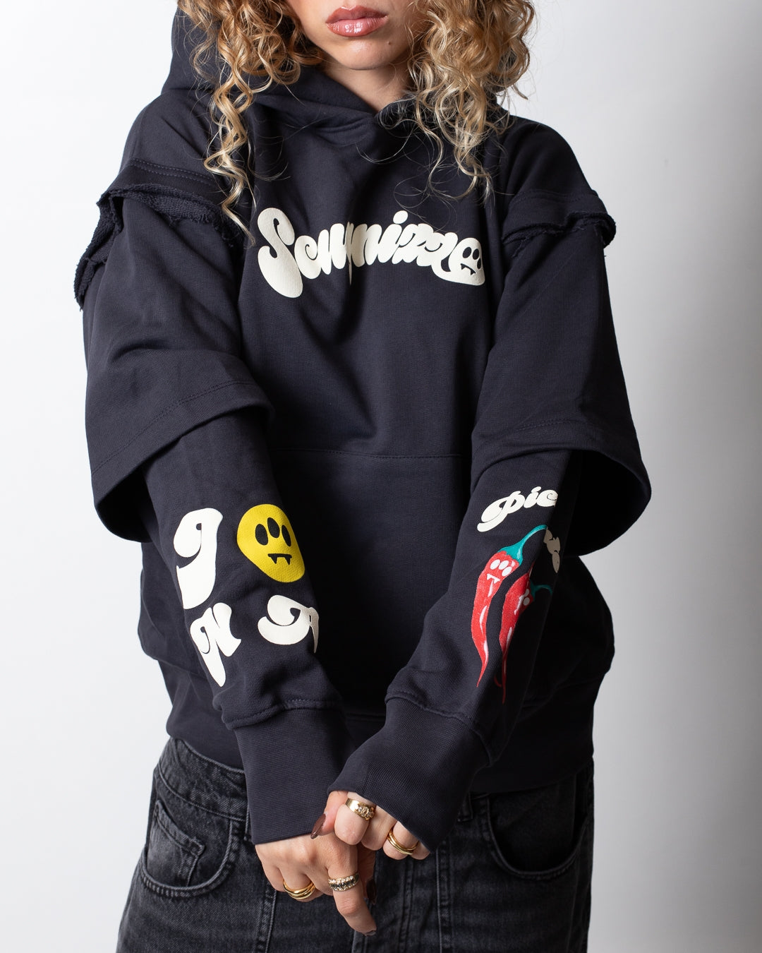 e fondo in costina, tasca frontale a marsupio, stampe applicate