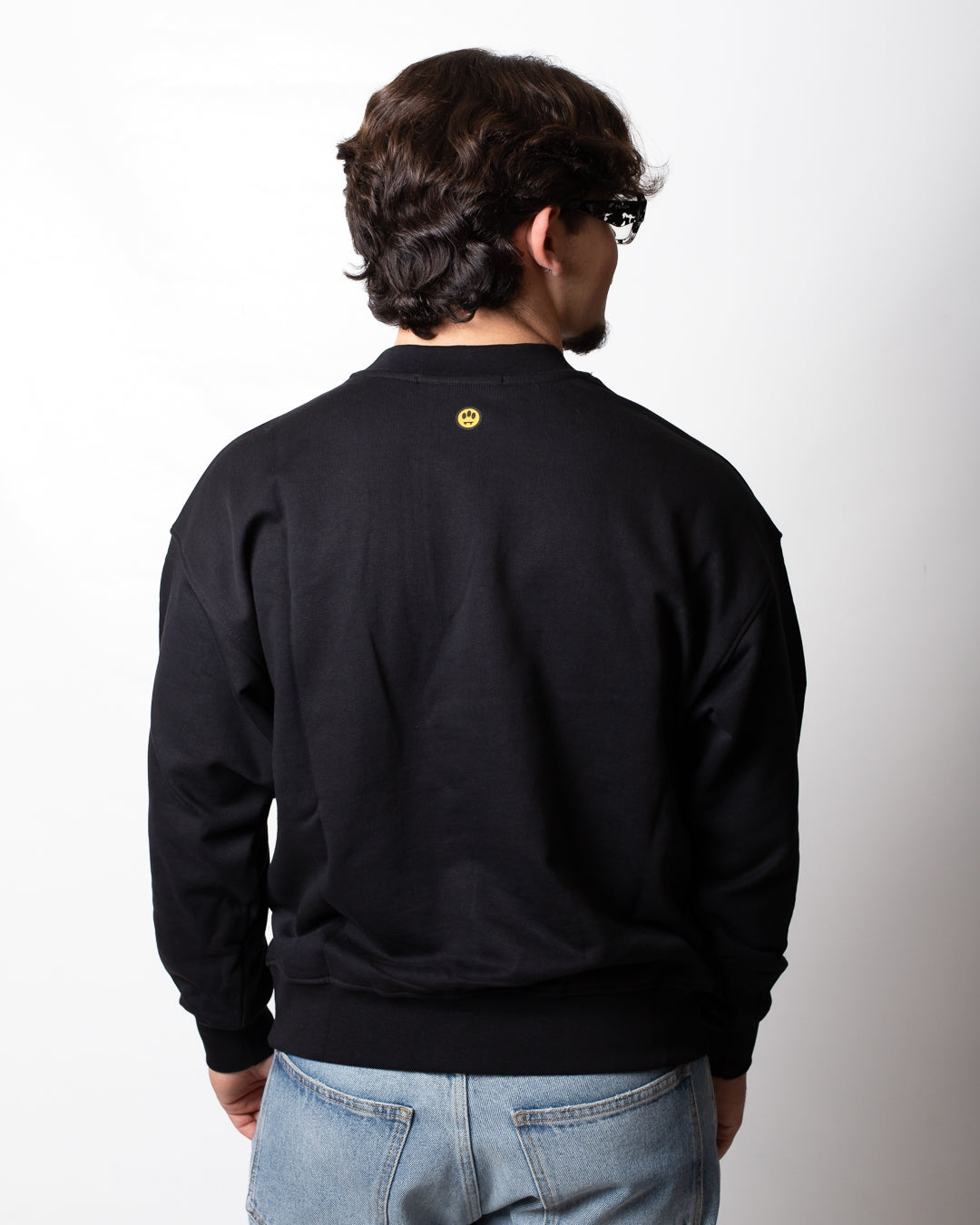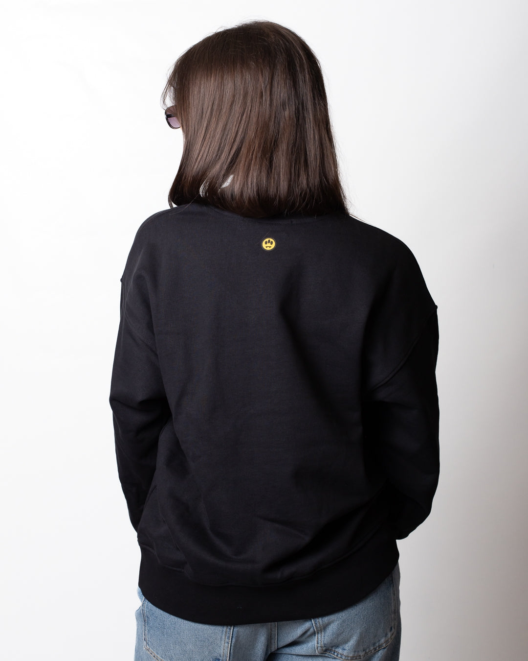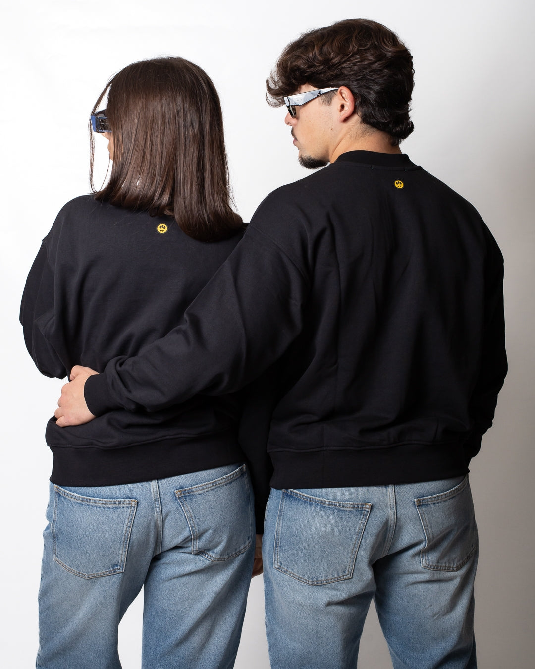 Felpa Barrow nera, unica variante. Girocollo, maniche lunghe, fondo dritto, vestibilità rilassata, collo, polsini e fondo in costina, logo smile stampato sul retro e stampa Teddy applicata frontalmente con logo a contrasto.