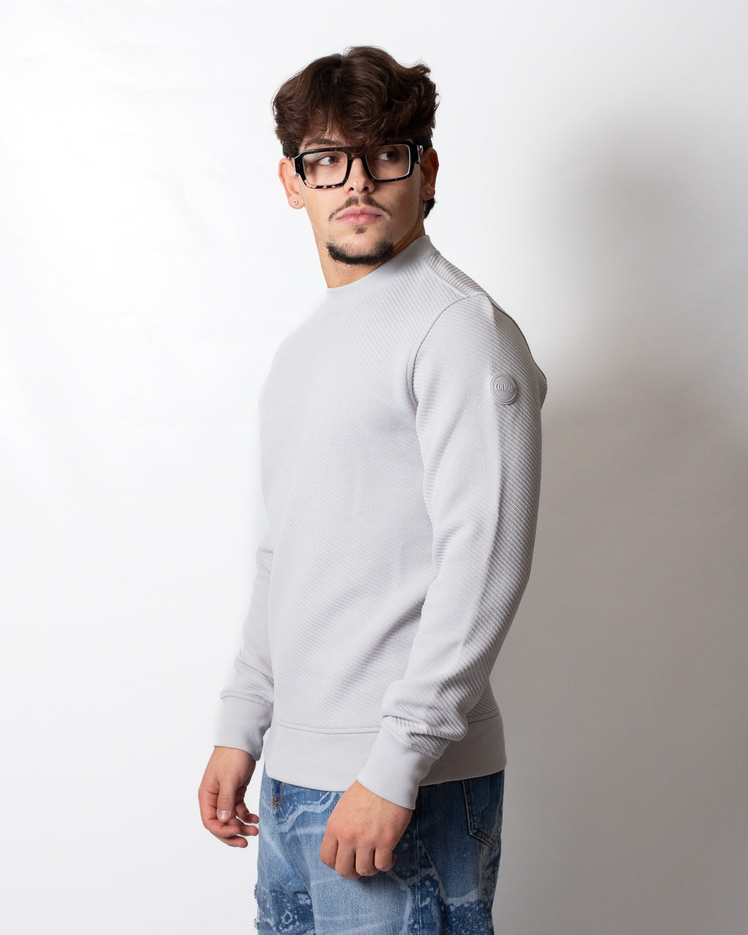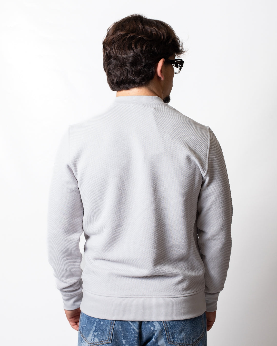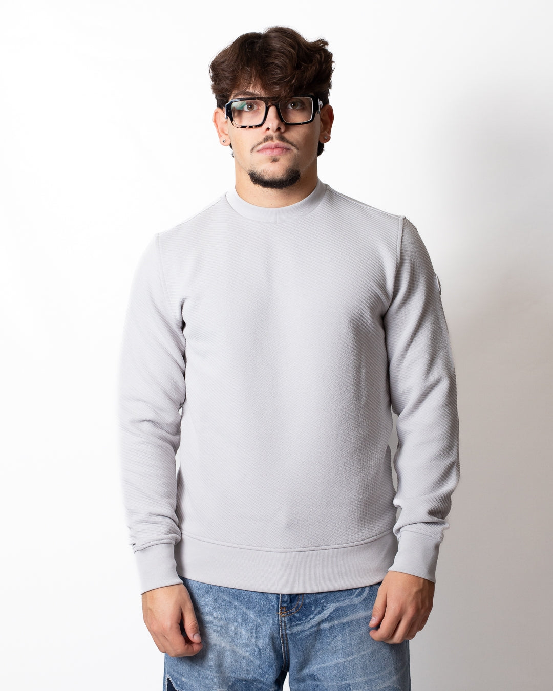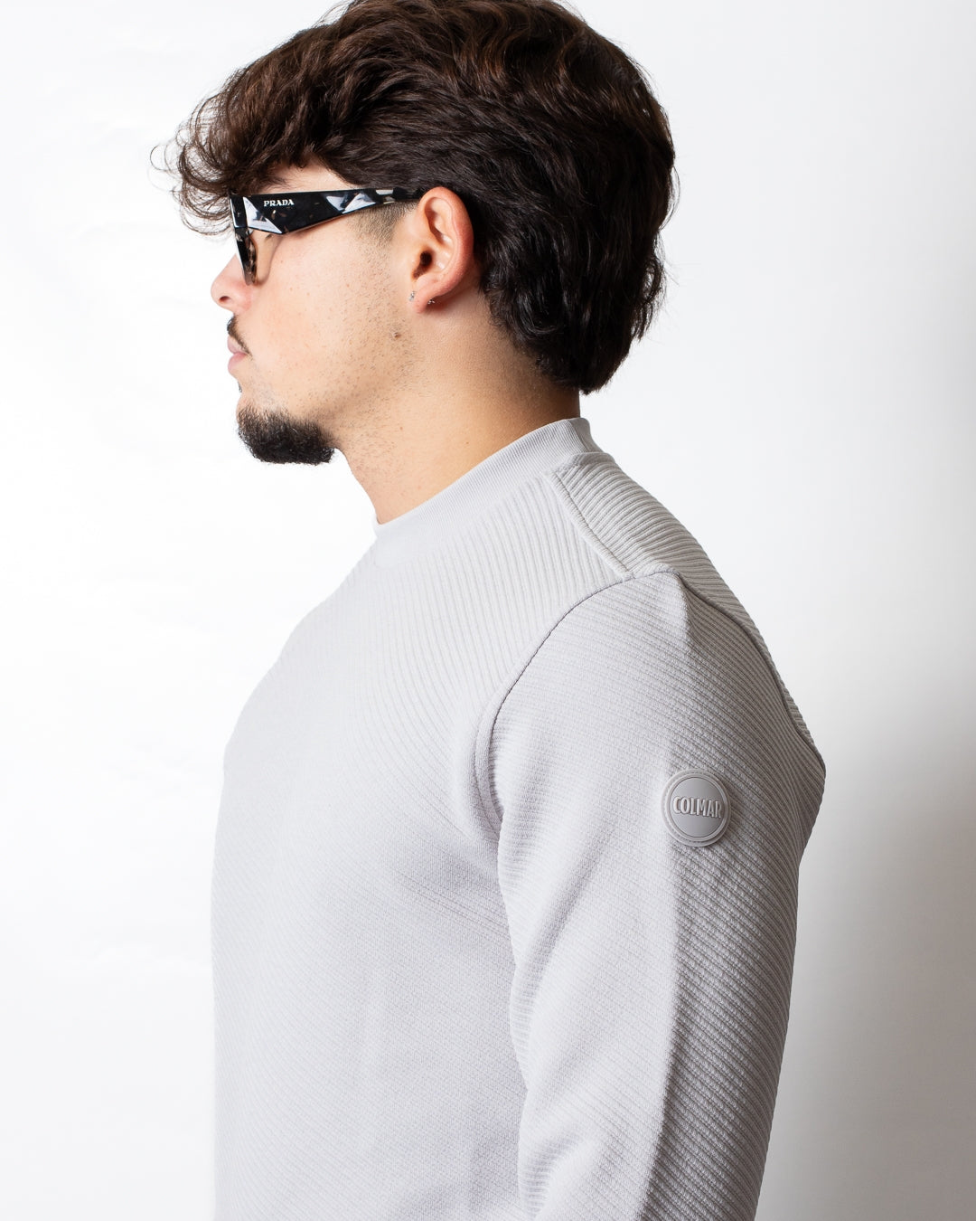 Felpa Colmar grigia, unica variante. Design in costina all-over, girocollo, maniche lunghe, collo, polsini e fondo in costina, fondo dritto e logo in silicone applicato tono su tono sulla manica.
