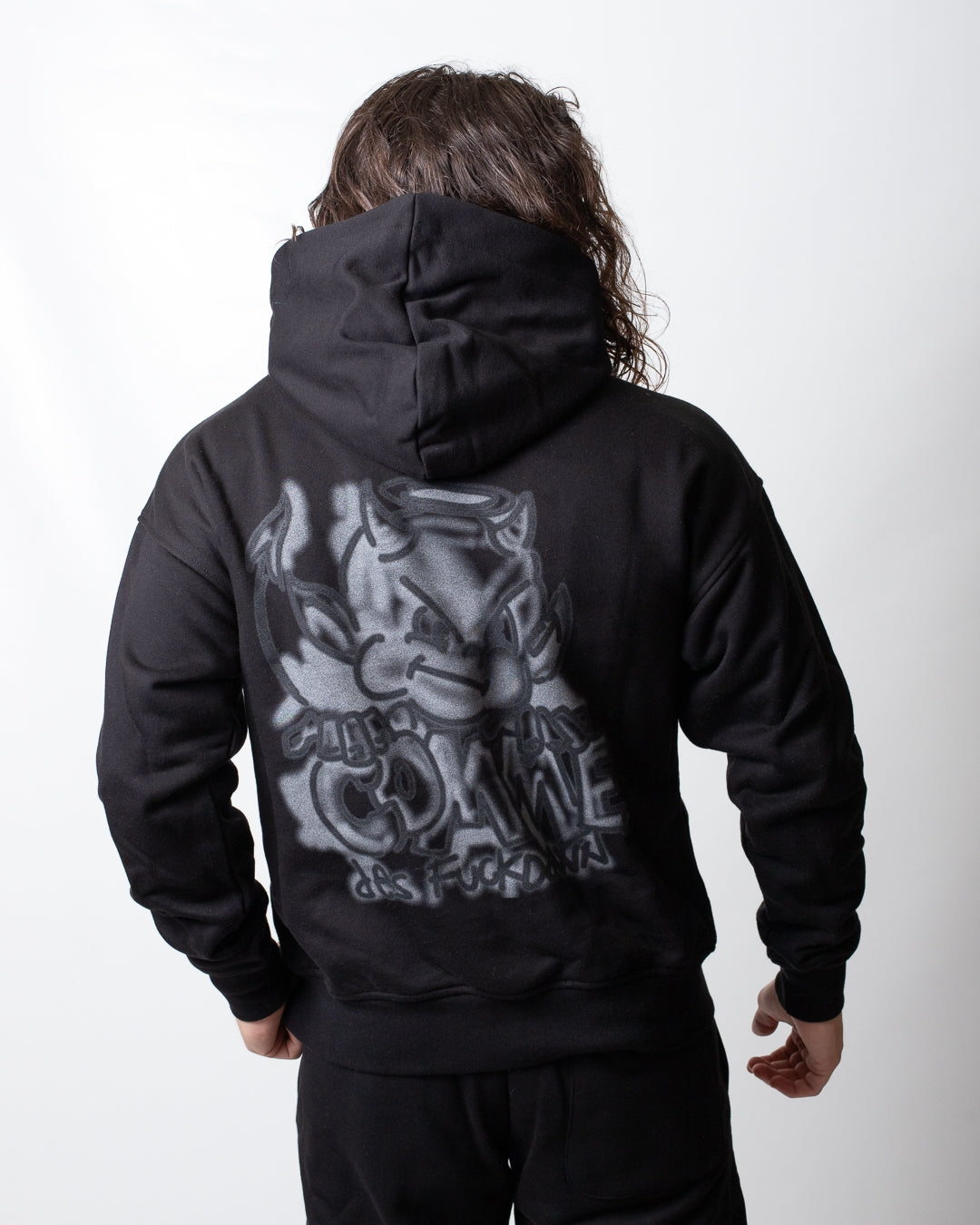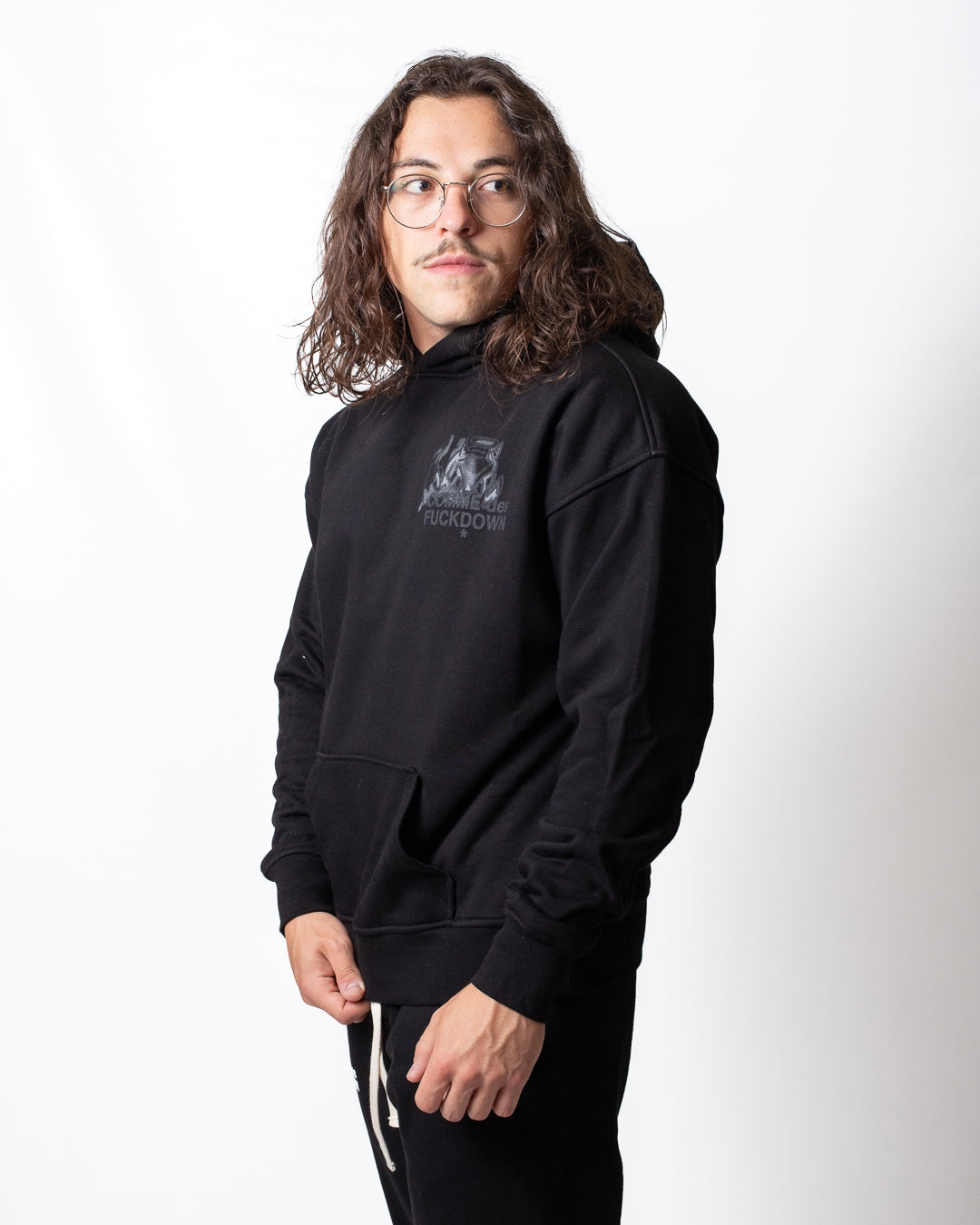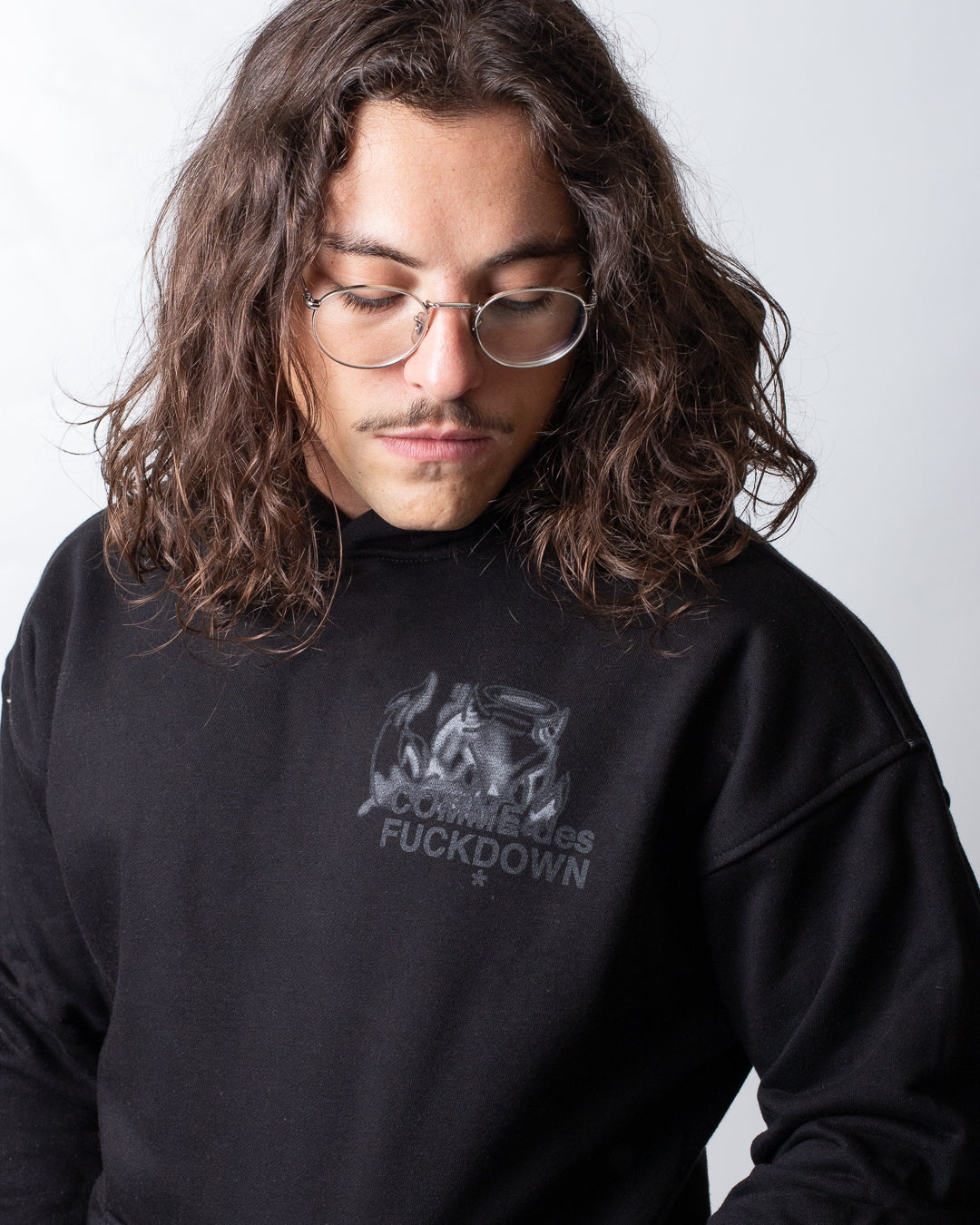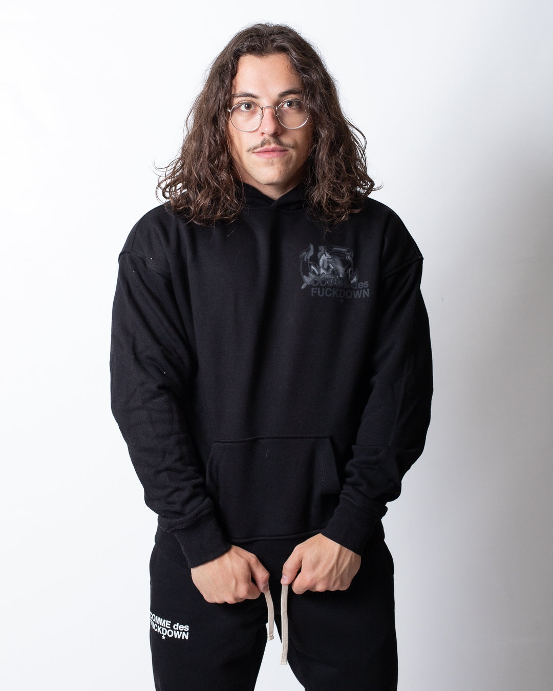 Felpa Comme des Fuckdown nera, unica variante. Cappuccio, maniche lunghe, polsini e fondo in costina, tasca frontale a marsupio, logo stampato a contrasto sul petto e stampa murales applicata sulla schiena.