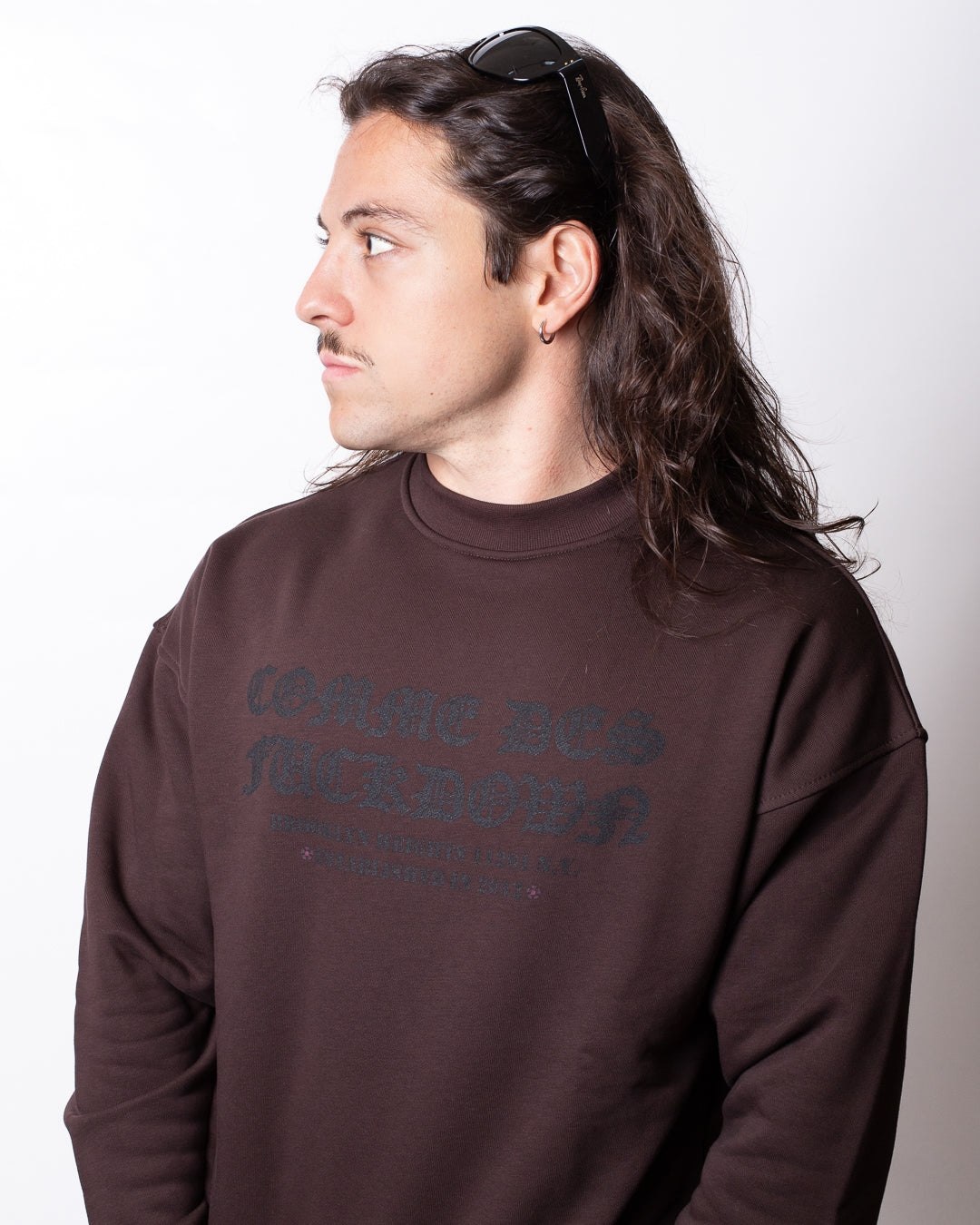 Felpa Comme des Fuckdown marrone, unica variante. Girocollo, maniche lunghe, polsini, fondo e collo in costina e stampe gothic con logo applicate a contrasto su petto e schiena