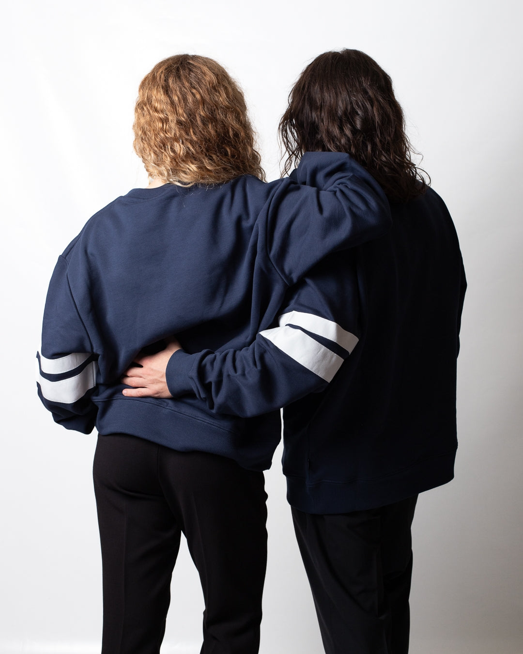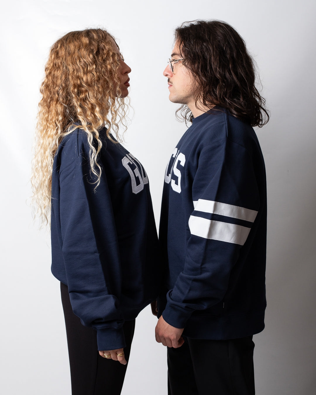 Felpa GCDS blu/bianca, unica variante. Girocollo, maniche lunghe, vestibilità rilassata, collo, polsini e fondo in costina, etichetta logata applicata lateralmente, bande ricamate sulla manica e "Logo Regular" ricamato a contrasto sul davanti.