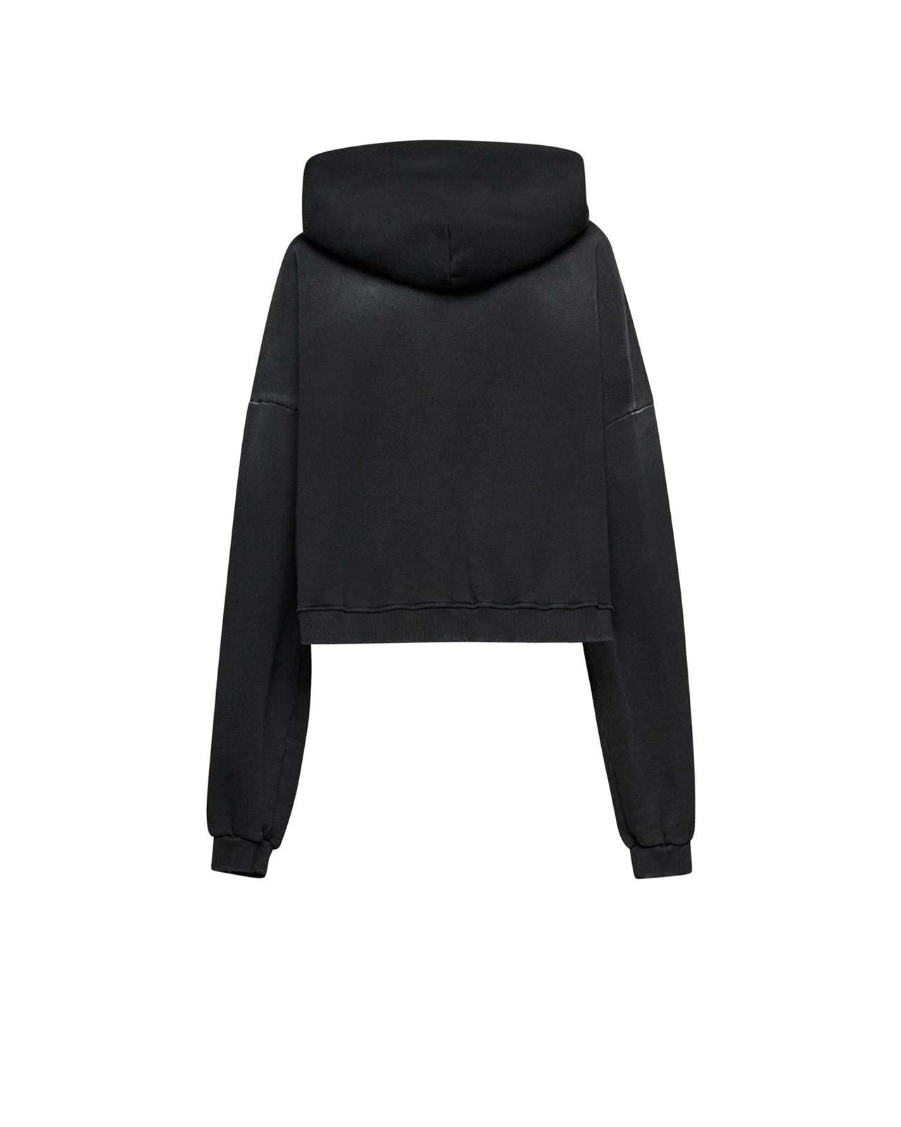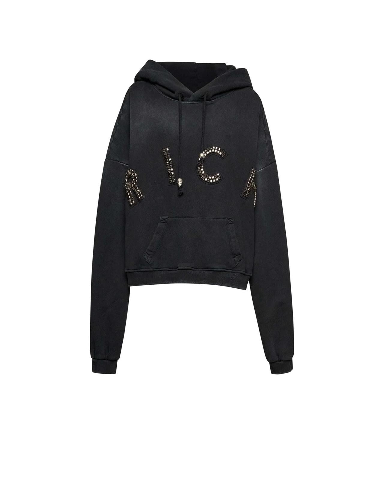 Felpa John Richmond nera, unica variante. Cappuccio con coulisse di regolazione, maniche lunghe, polsini e fondo in costina, vestibilità rilassata, tasca frontale a marsupio e logo RICH applicato frontalmente con gioielli.