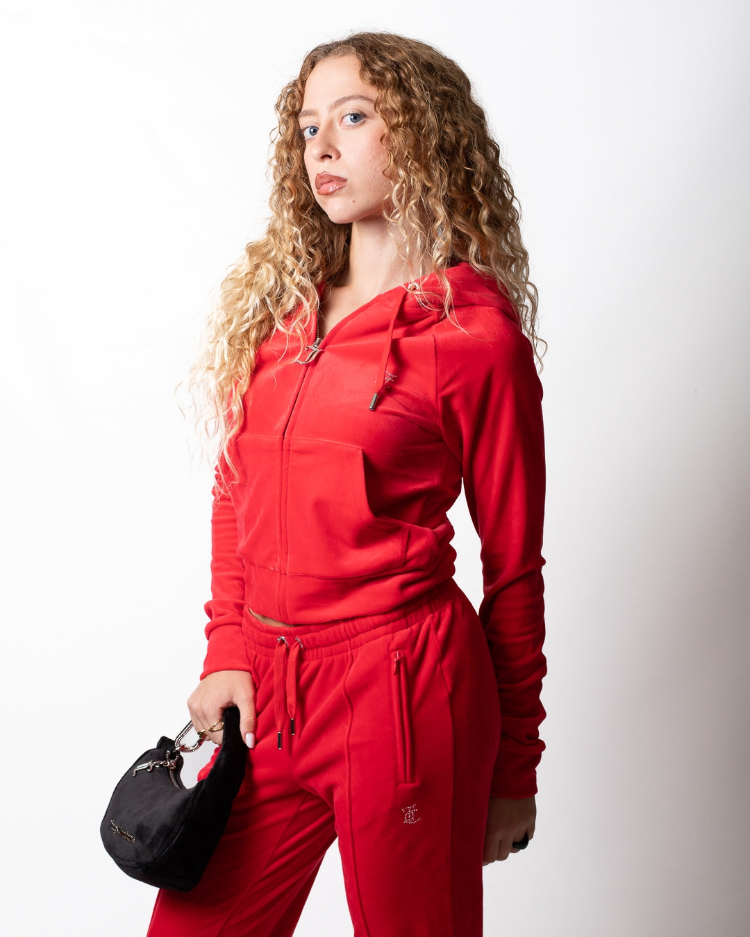 Felpa Juicy Couture toreador, unica variante. Texture effetto velluto, modello cropped, design fullzip, cappuccio con coulisse di regolazione, maniche lunghe, tasche laterali, polsini e fondo elasticizzati e logo con strass applicato sul petto e sulla schiena.