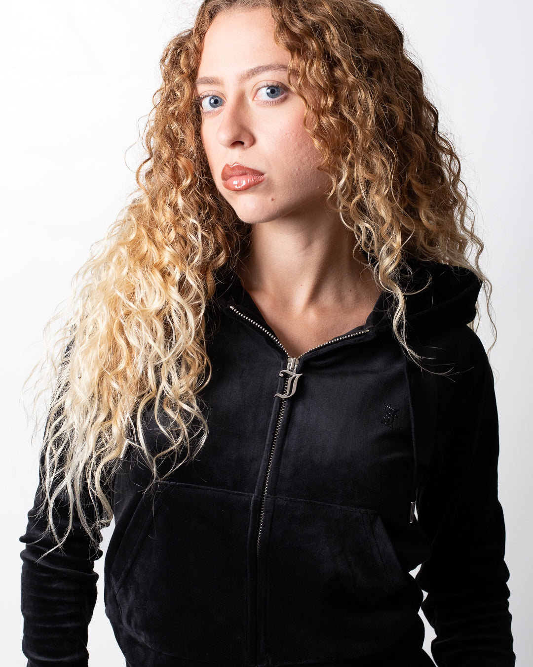 Felpa Juicy Couture nera, unica variante. Texture effetto velluto, modello cropped, design fullzip, cappuccio con coulisse di regolazione, maniche lunghe, tasche laterali, polsini e fondo elasticizzati e logo con strass applicato sul petto e sulla schiena.