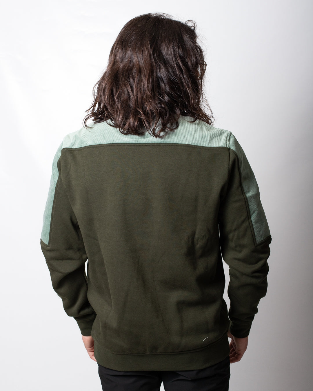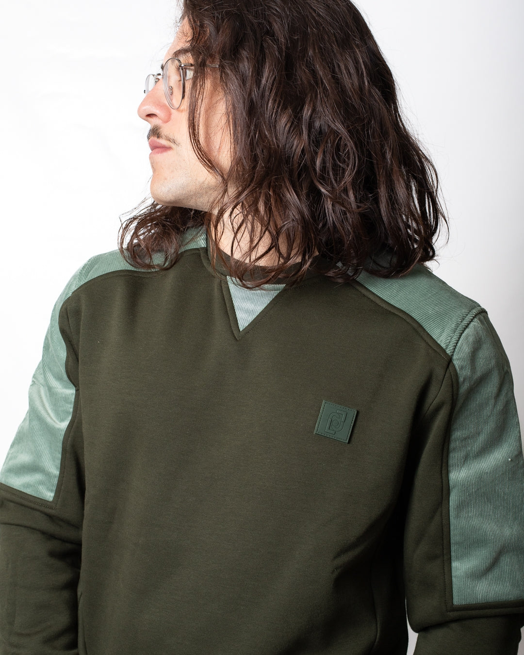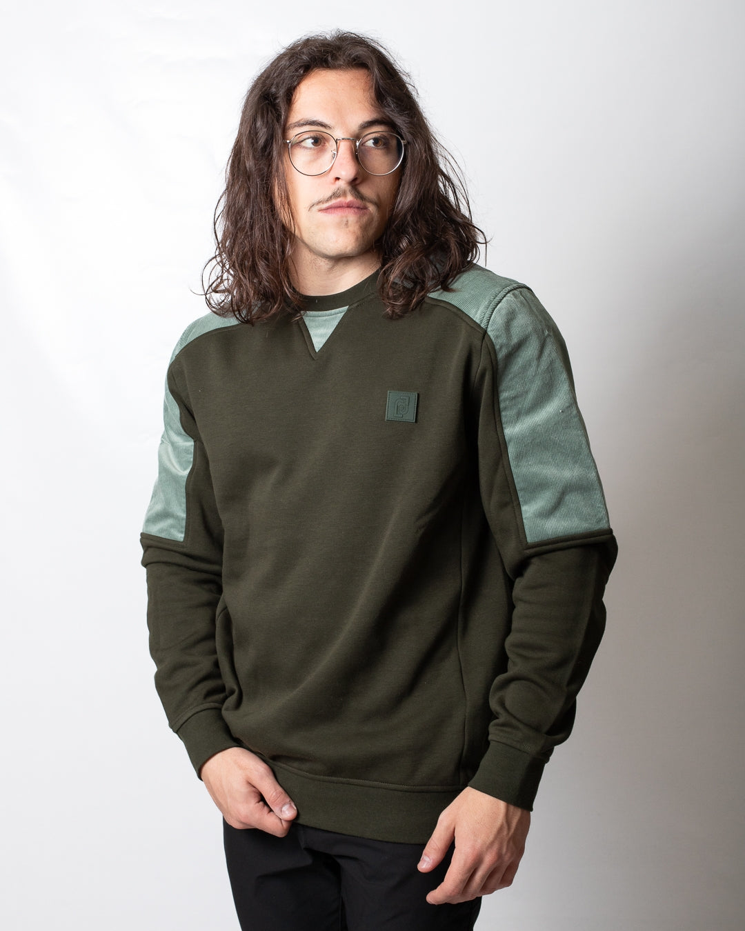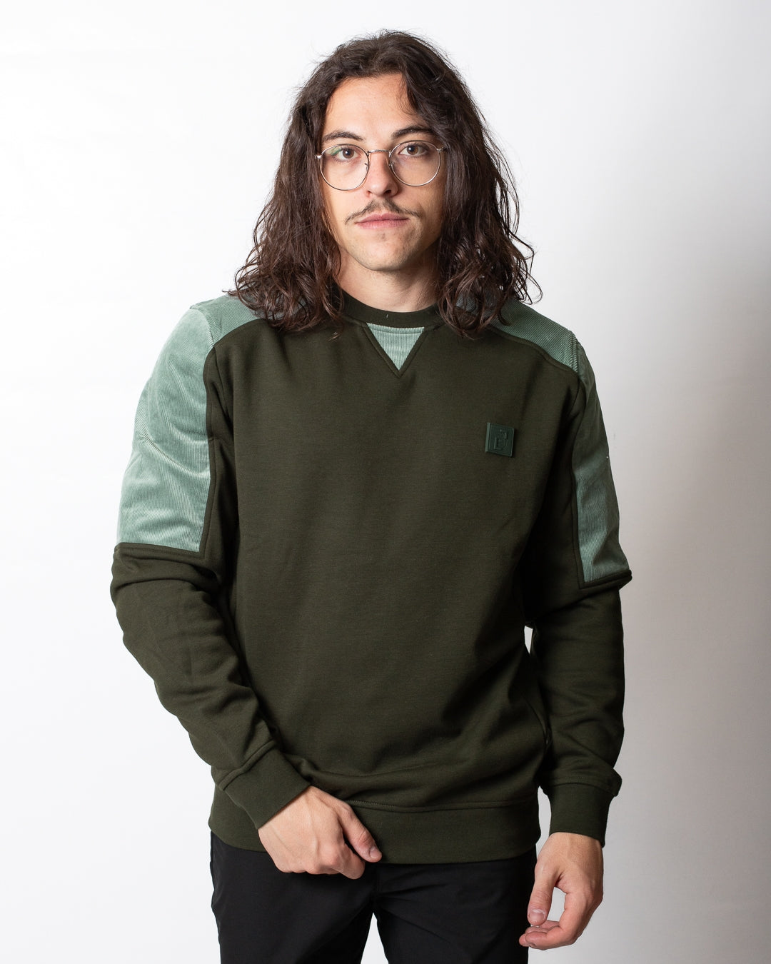 Felpa Liu Jo muschio, unica variante. Girocollo, maniche lunghe, collo, polsini e fondo in costina, vestibilità regular, dettagli in camoscio su collo e spalle e logo in silicone applicato sul petto.