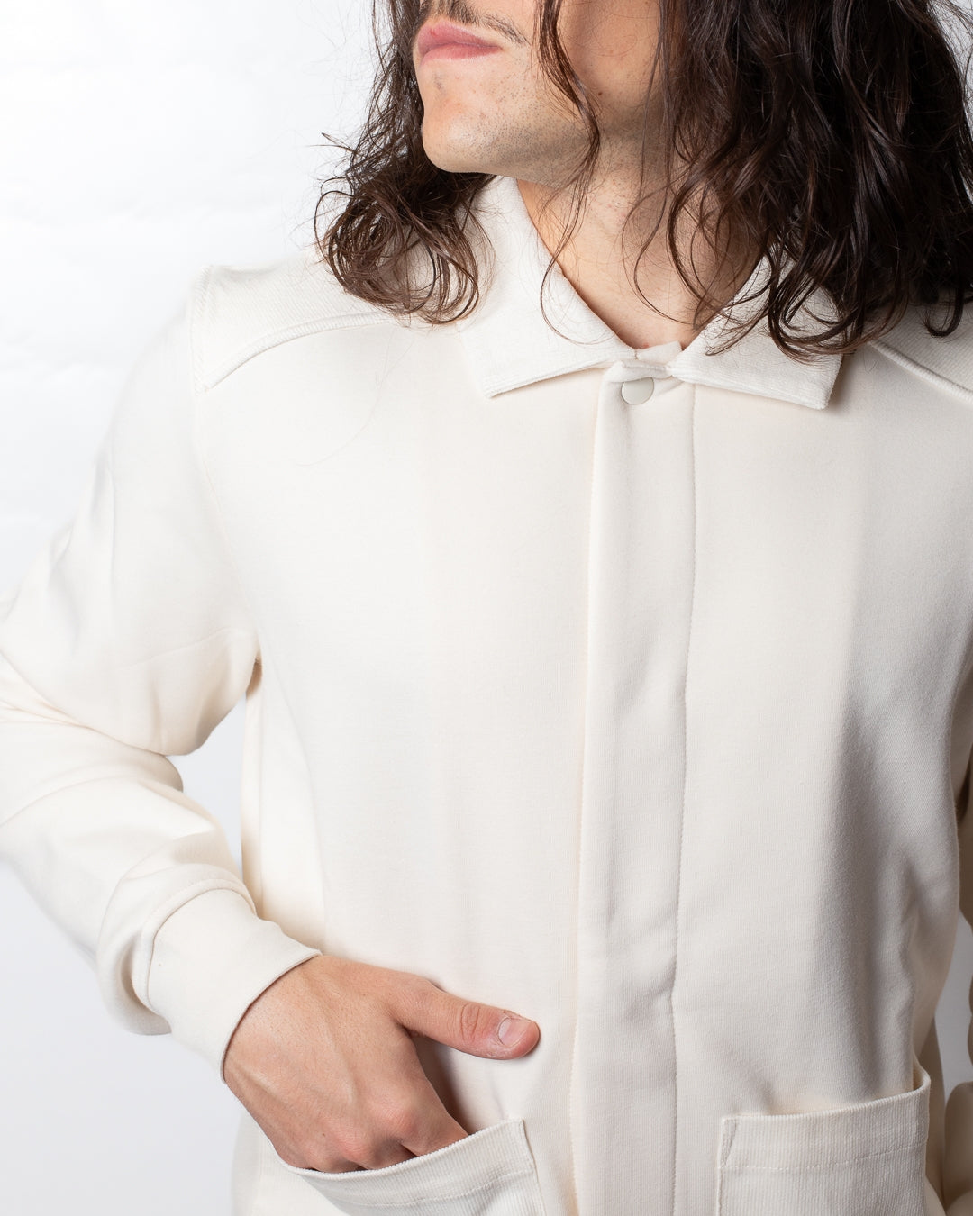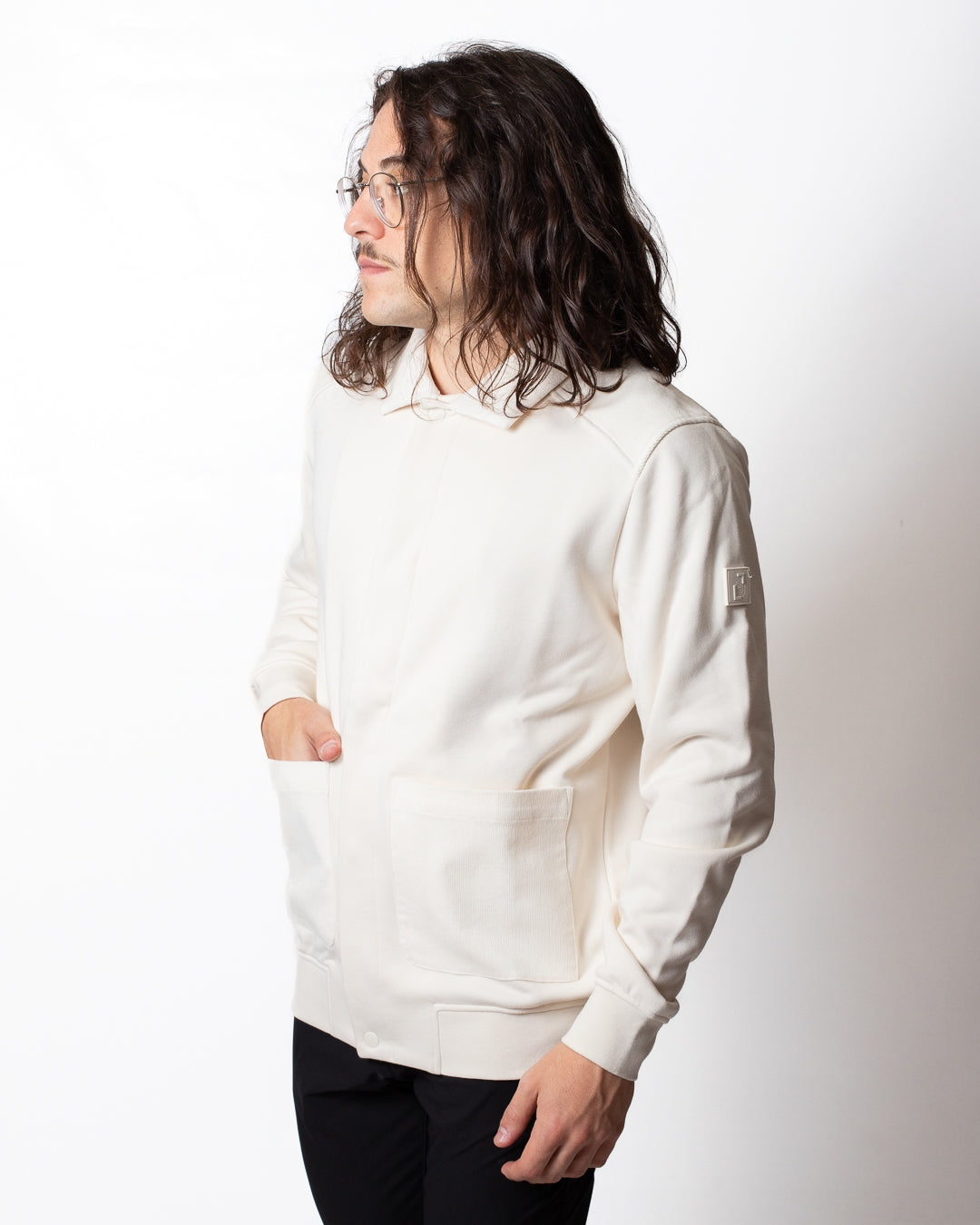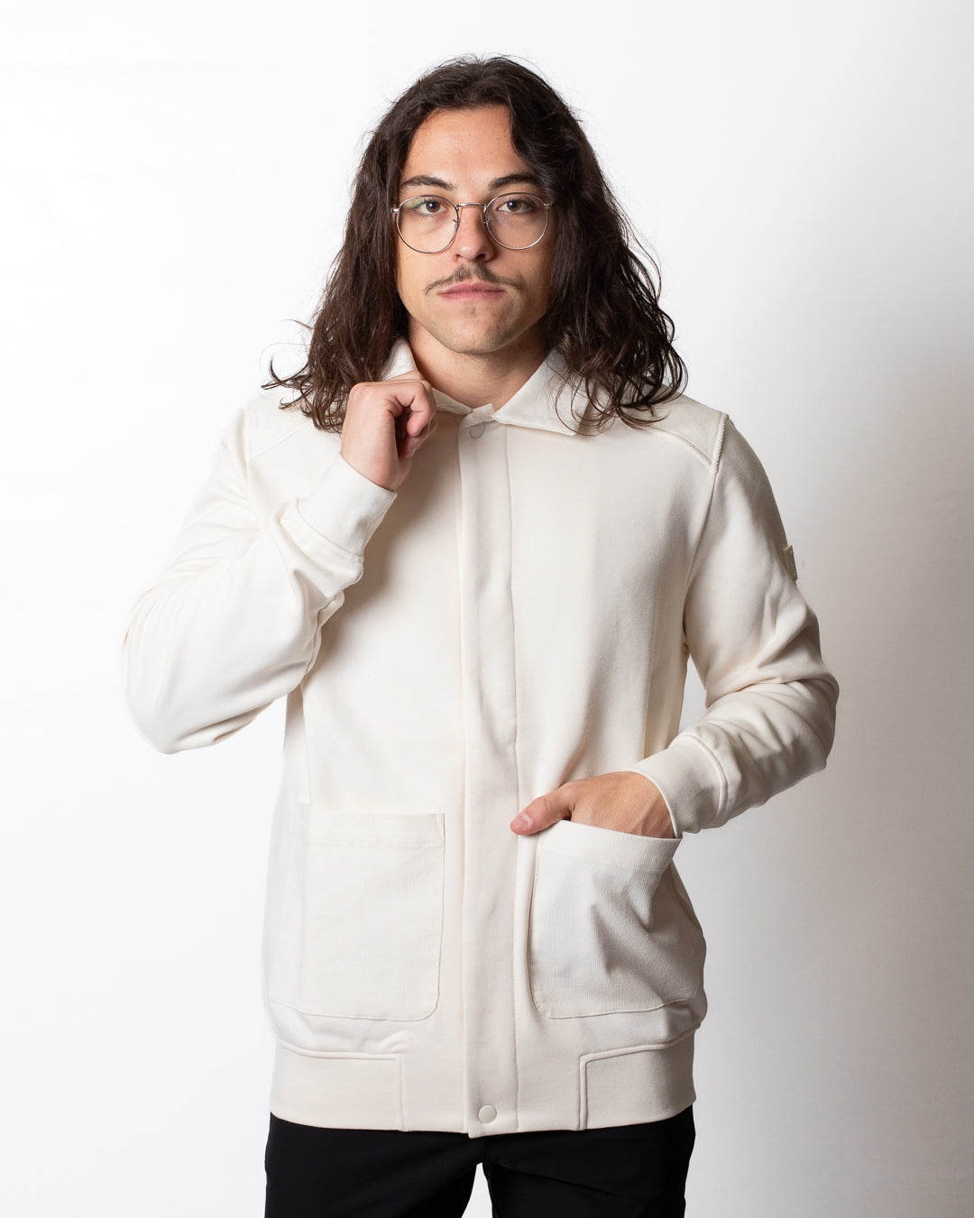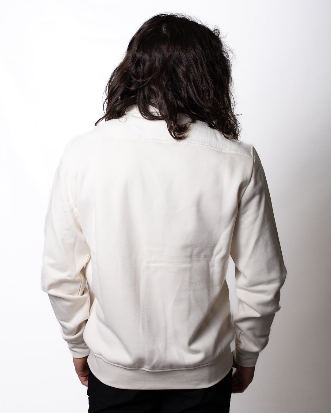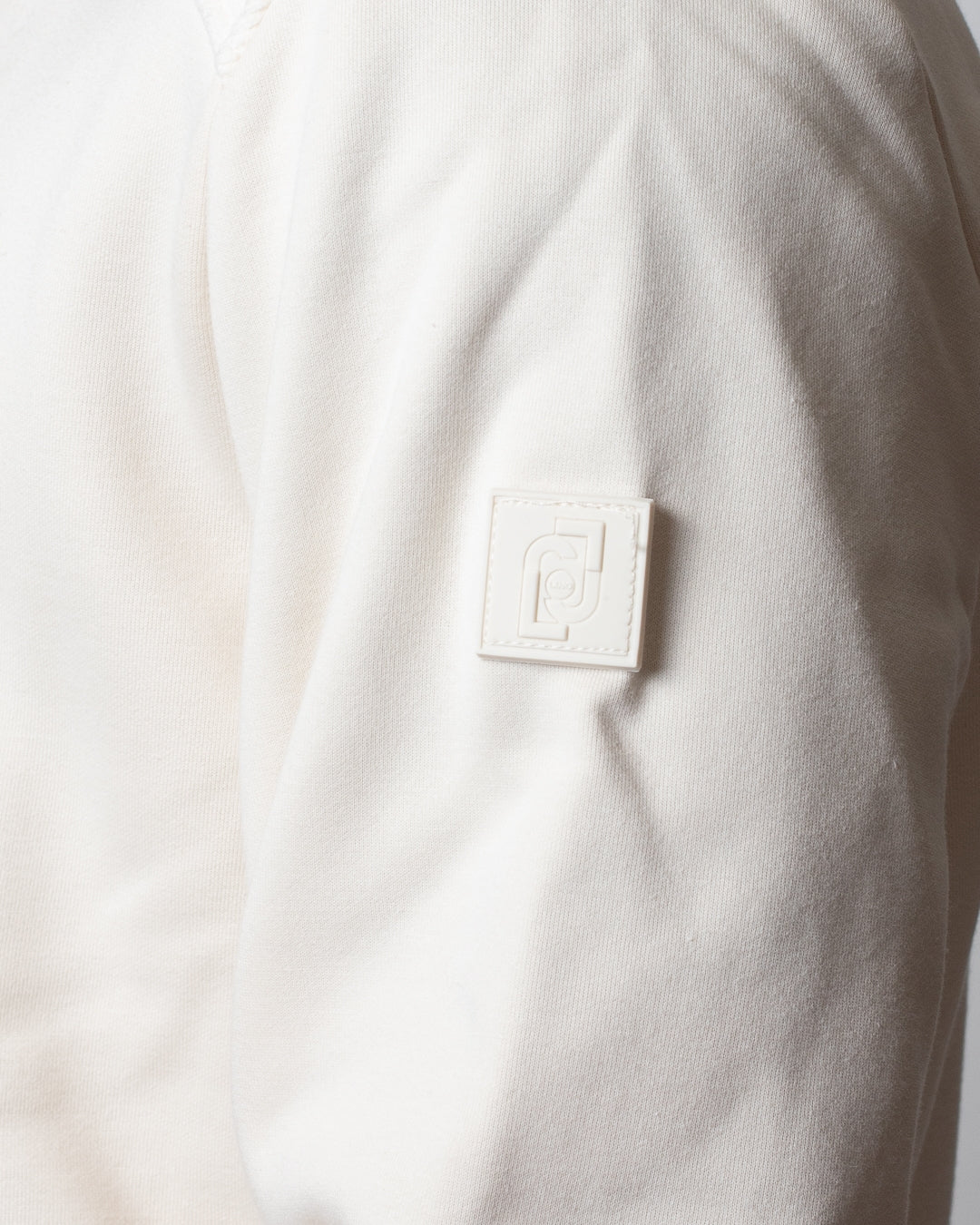 Felpa Liu Jo panna, unica variante. Collo a punta, maniche lunghe, chiusura frontale con bottoni, tasche frontali, dettagli in costina e logo in silicone applicato tono su tono sulla manica.