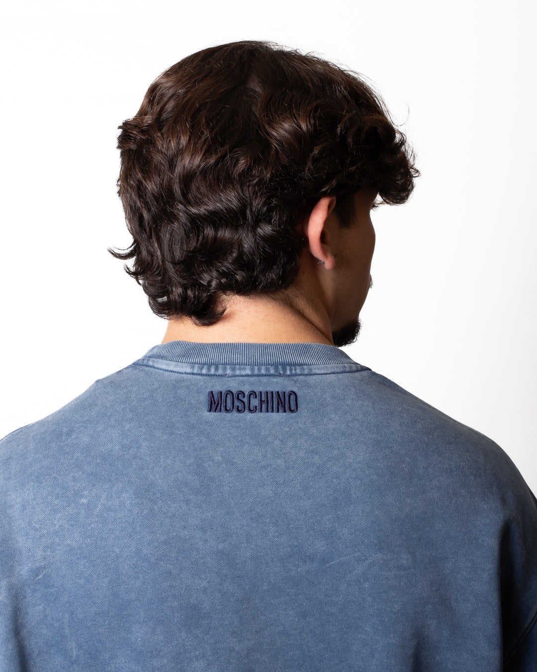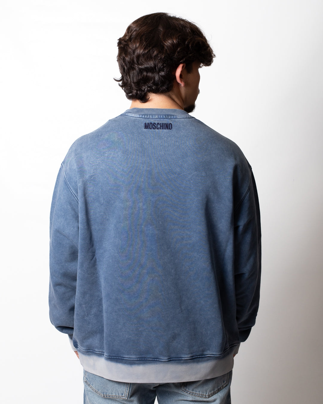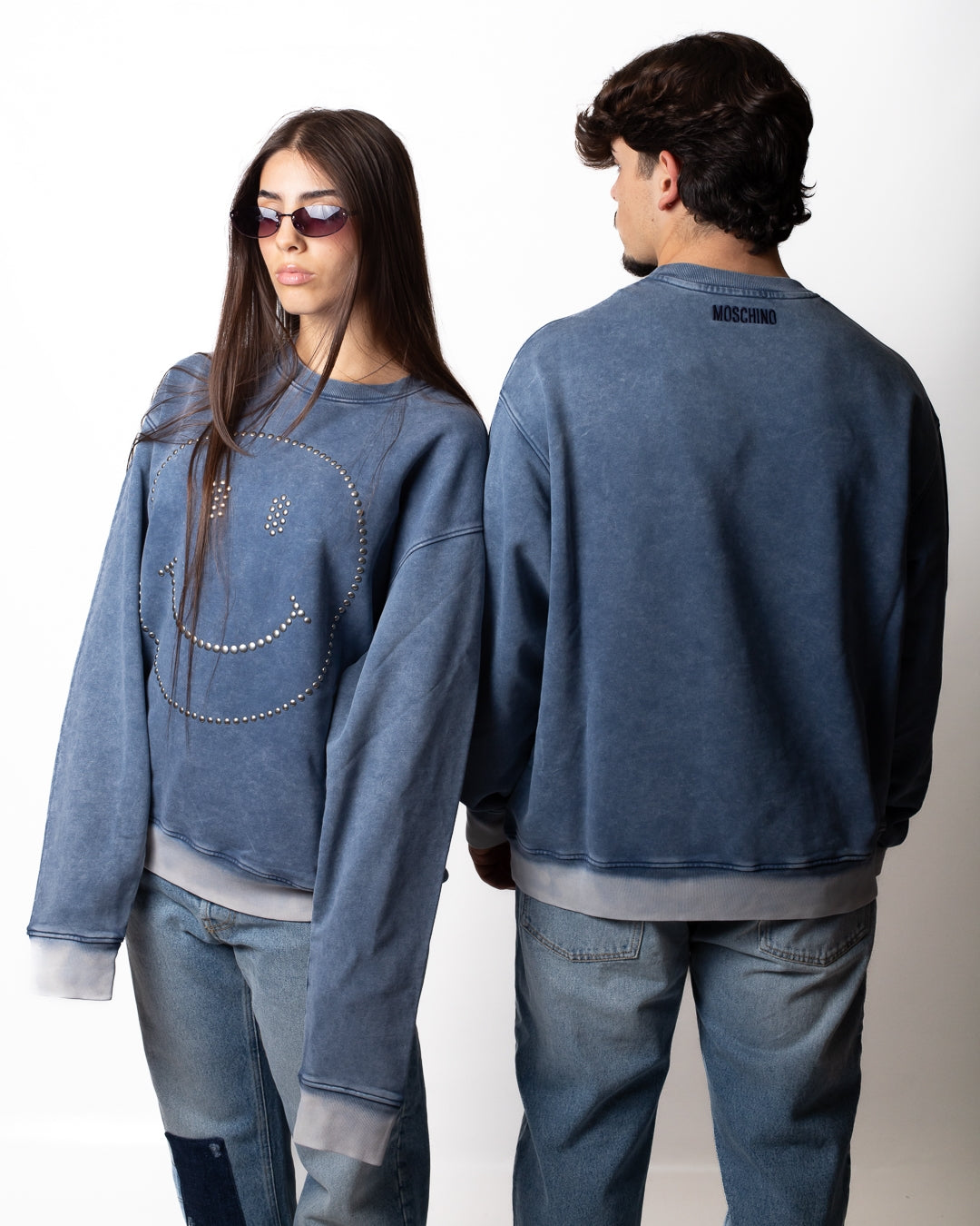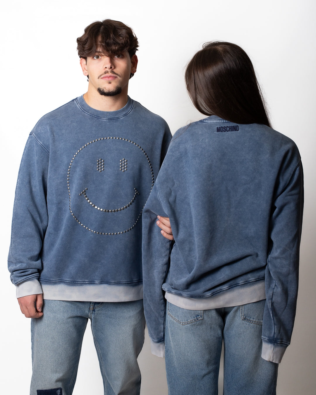 Felpa Moschino blu, unica variante. Girocollo, vestibilità rilassata, maniche lunghe, collo, polsini e fondo in costina, logo ricamato sul retro e logo "Smiley" applicato con borchie frontalmente.