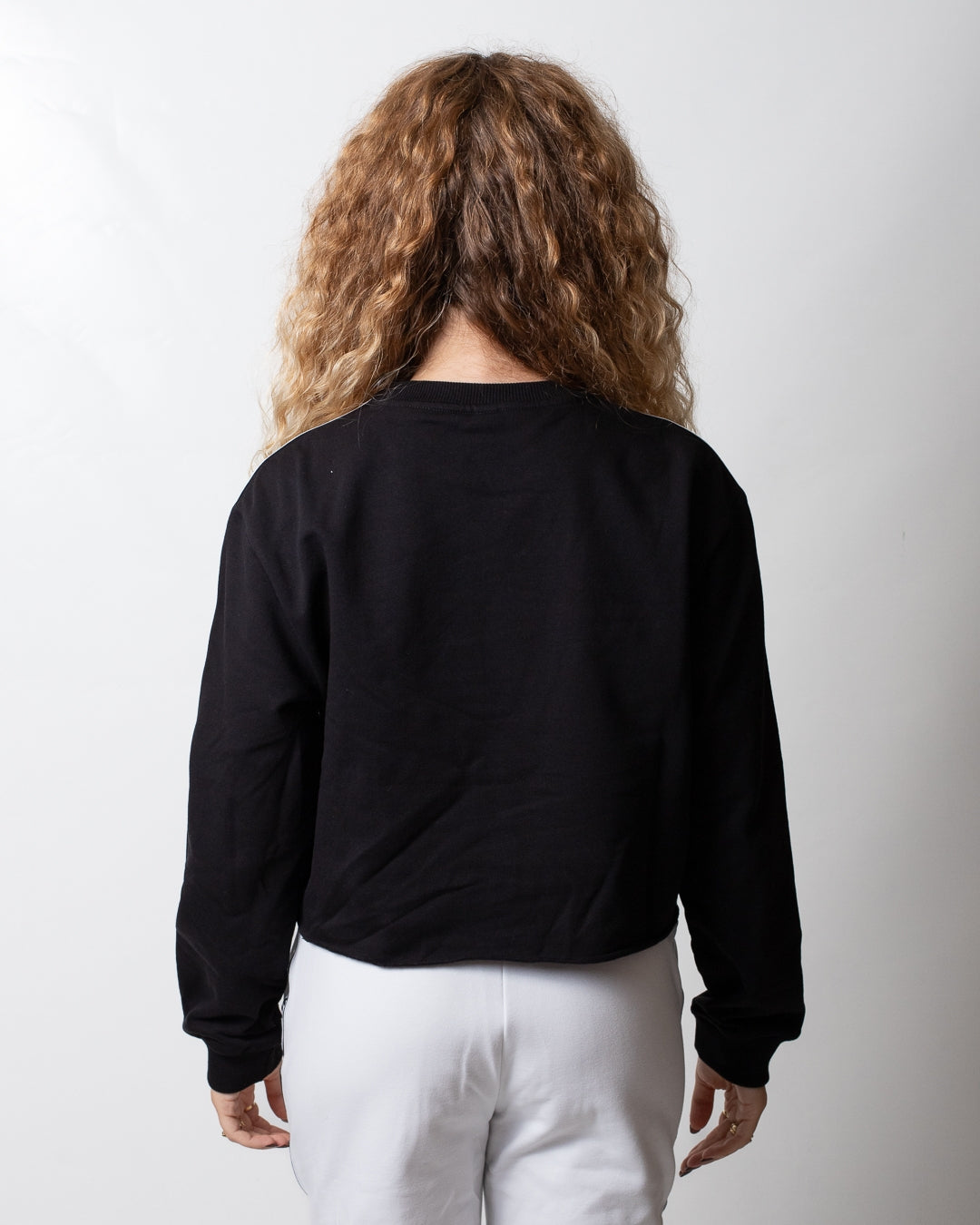 Felpa Moschino Underwear nera, unica variante. Girocollo, design cropped, maniche lunghe, polsini e collo in costina, fondo a taglio vivo, fasce logate applicate sulle maniche e logo in silicone applicato tono su tono sul petto.