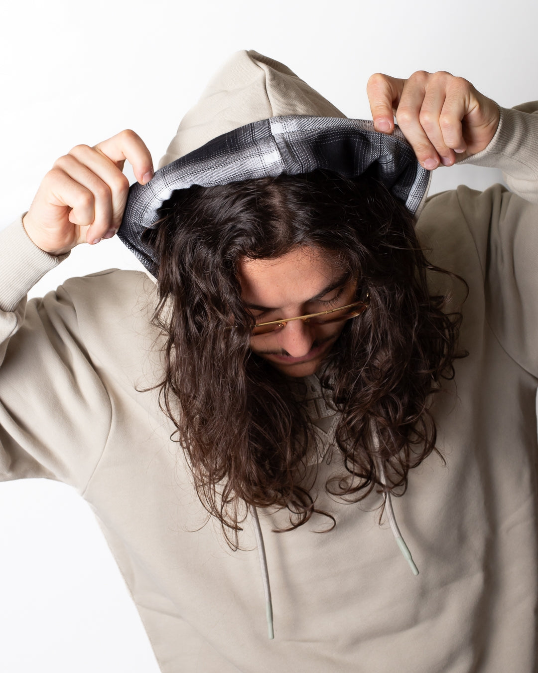 Felpa Richmond X beige, unica variante. Vestibilità rilassata, cappuccio con coulisse di regolazione, maniche lunghe, polsini e fondo in costina e patch in rilievo logata Richmond X applicata sul davanti.