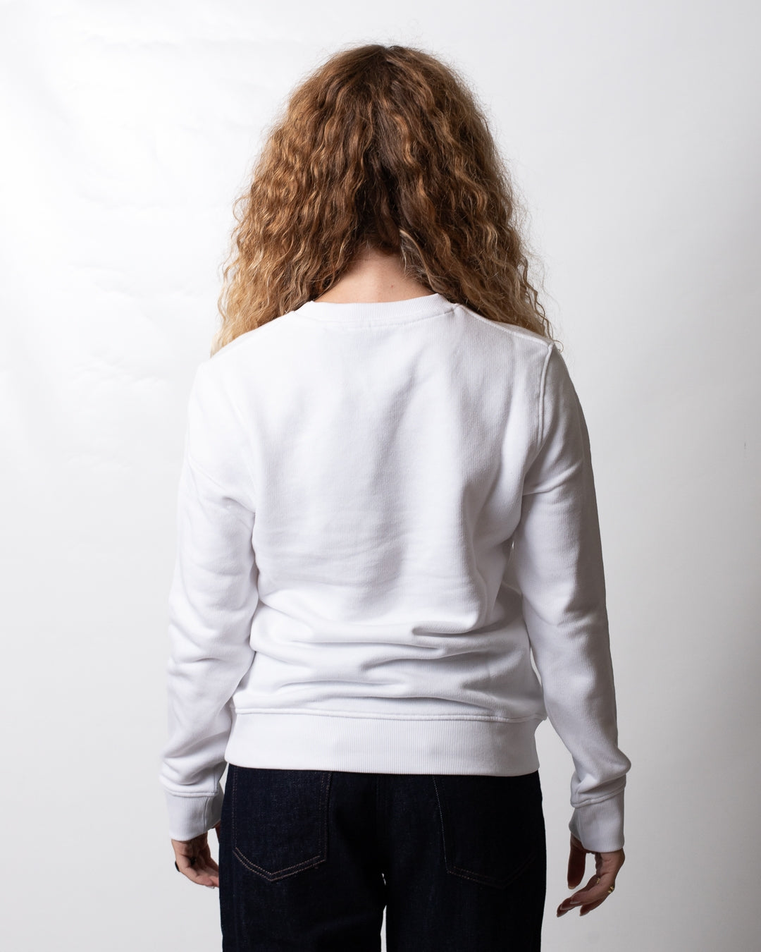 Felpa Richmond X bianca, unica variante. Girocollo, vestibilità regular, maniche lunghe, collo, fondo e polsini in costina e stampa "I love Rock" con strass applicata frontalmente.