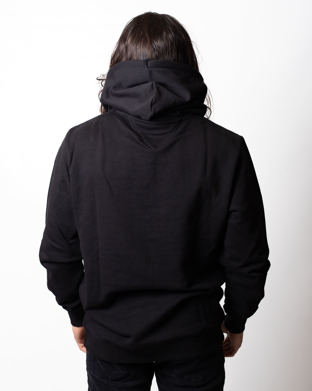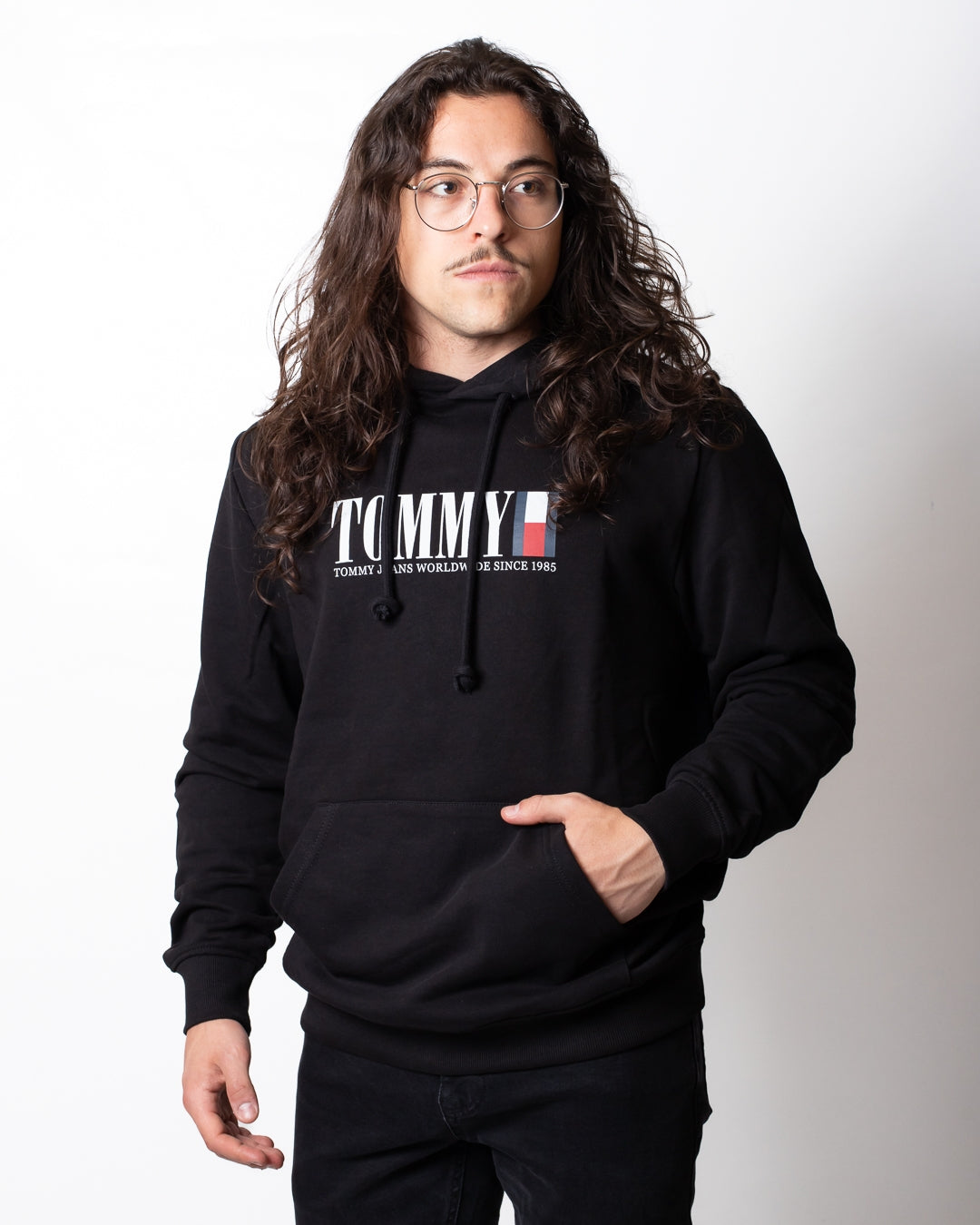Felpa Tommy Jeans nera, unica variante. Cappuccio con coulisse di regolazione, vestibilità regular, maniche lunghe, polsini e fondo in costina, tasca frontale a marsupio e stampa logata applicata frontalmente.