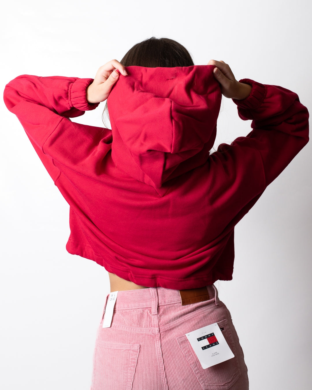 Felpa Tommy Jeans bordeaux, unica variante. Design cropped, cappuccio, maniche lunghe, polsini e fondo elasticizzati, coulisse di regolazione applicata in vita, logo flag con strass applicato frontalmente e logo linear stampato a contrasto sul davanti.