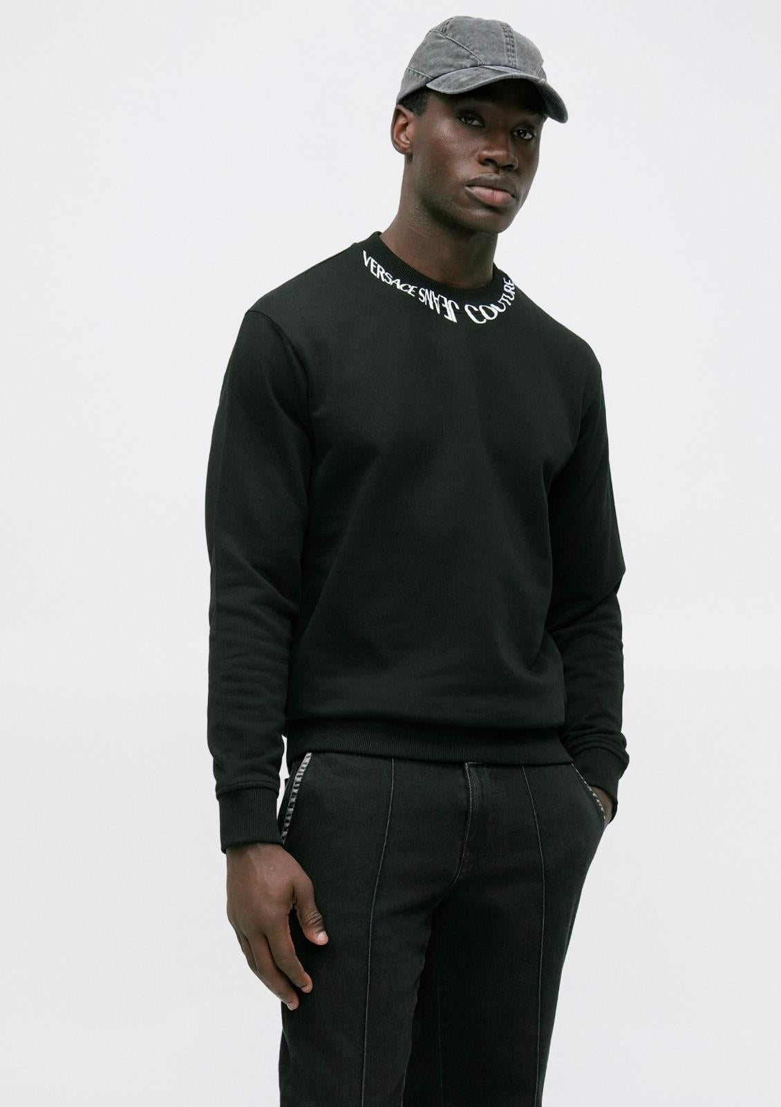 Felpa Versace Jeans Couture nera, unica variante. Girocollo, maniche lunghe, collo, polsini e fondo in costina, vestibilità rilassata e "Logo Liquify" stampato intorno al collo.
