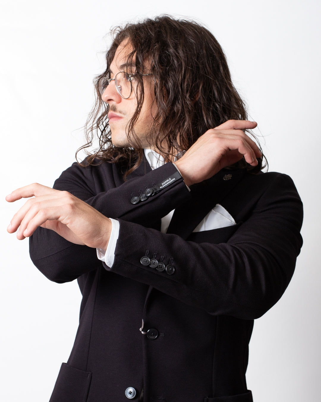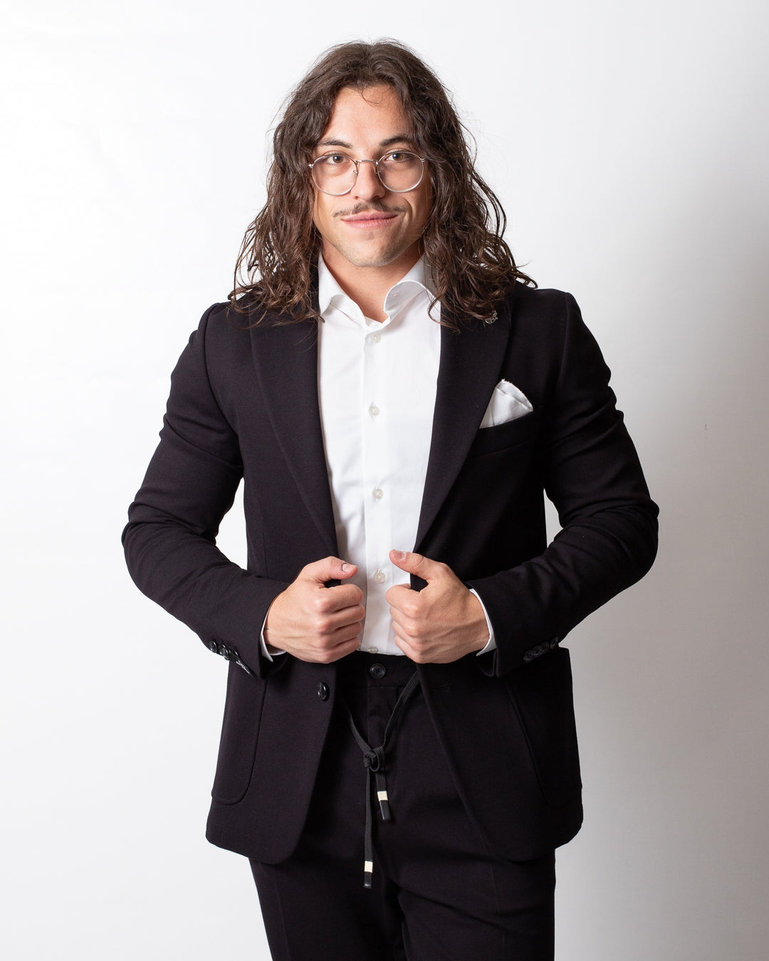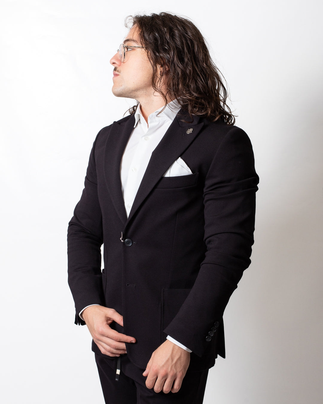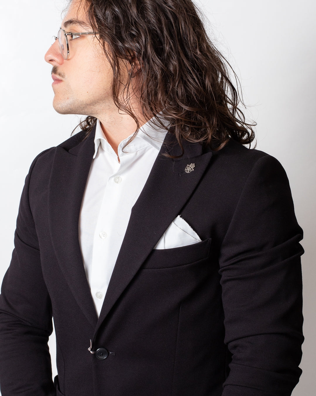 Giacca blazer Daniele Alessandrini nera, unica variante. Design monopetto, collo reverse, chiusura frontale con bottoni, maniche lunghe, bottoni sui polsini, tasche frontali, taschino con fazzoletto sul petto, spacchi sul retro e spilla in metallo applicata sul collo.
