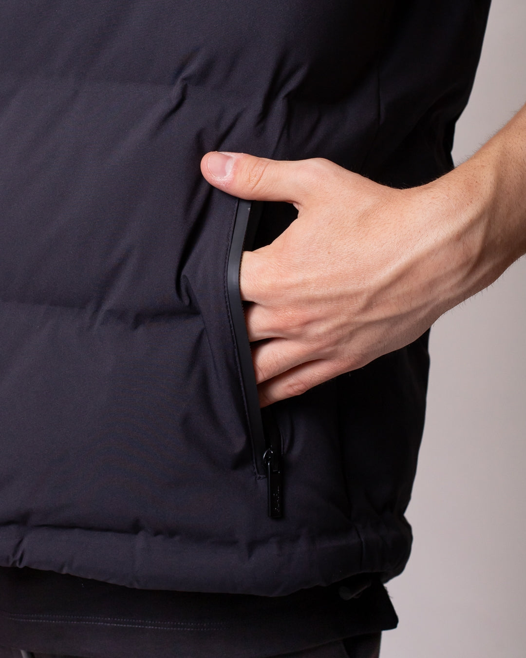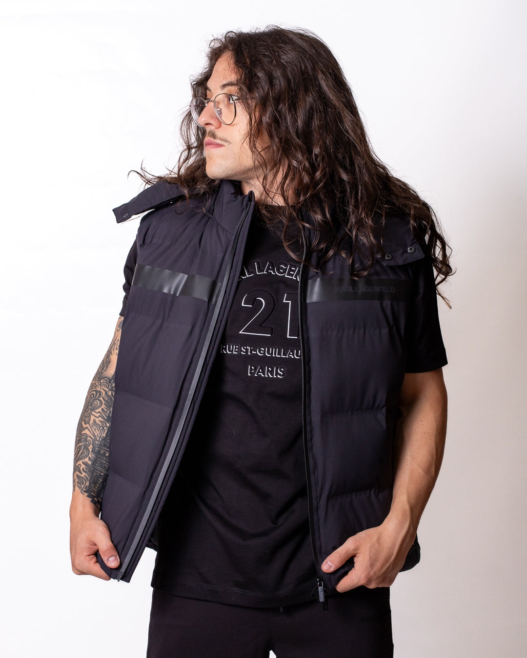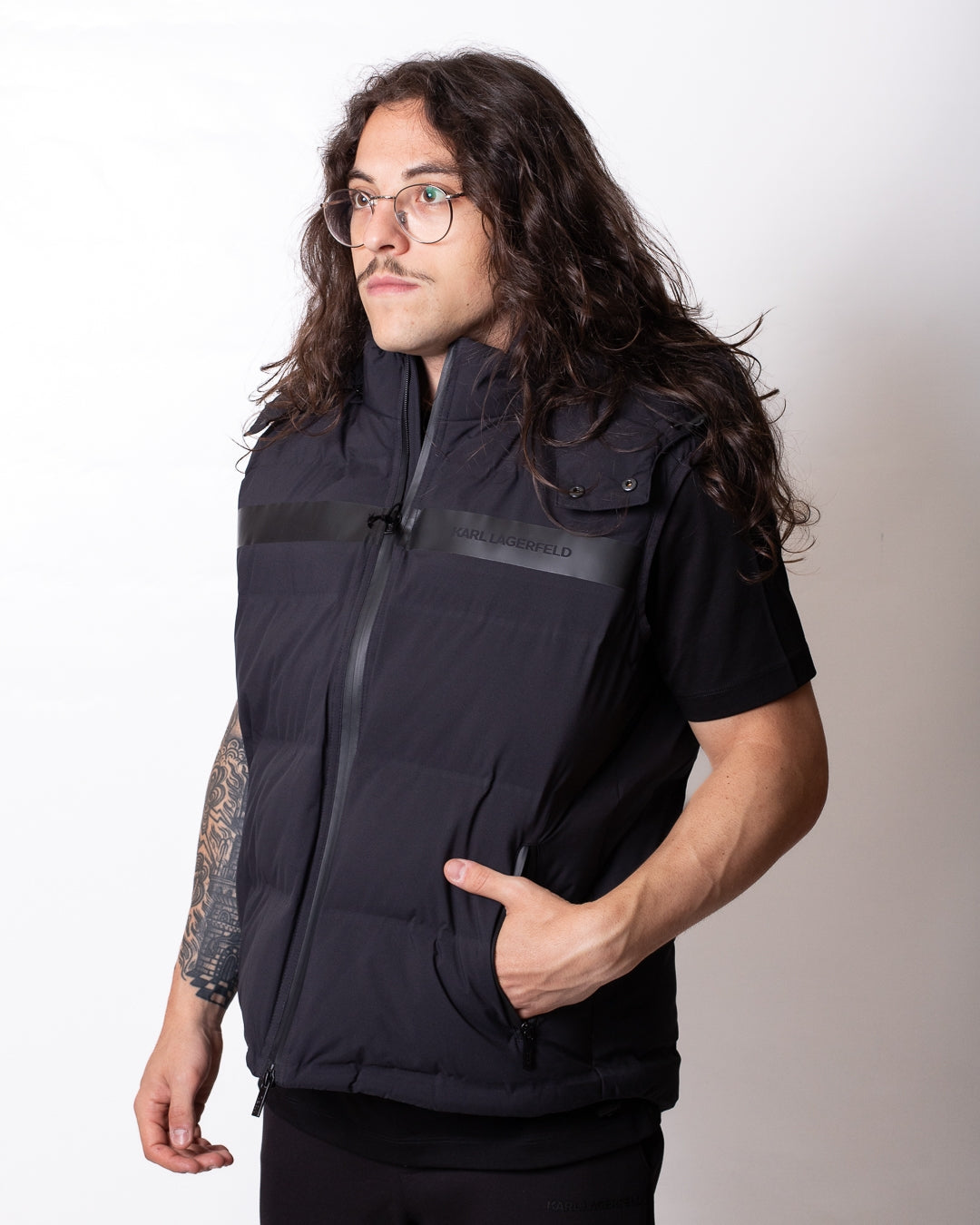Gilet Karl Lagerfeld nero, unica variante. Cappuccio removibile con coulisse di regolazione, collo alto, senza maniche, chiusura frontale con zip, tasche laterali con zip, coulisse di regolazione sul fondo e logo stampato sul davanti tono su tono.