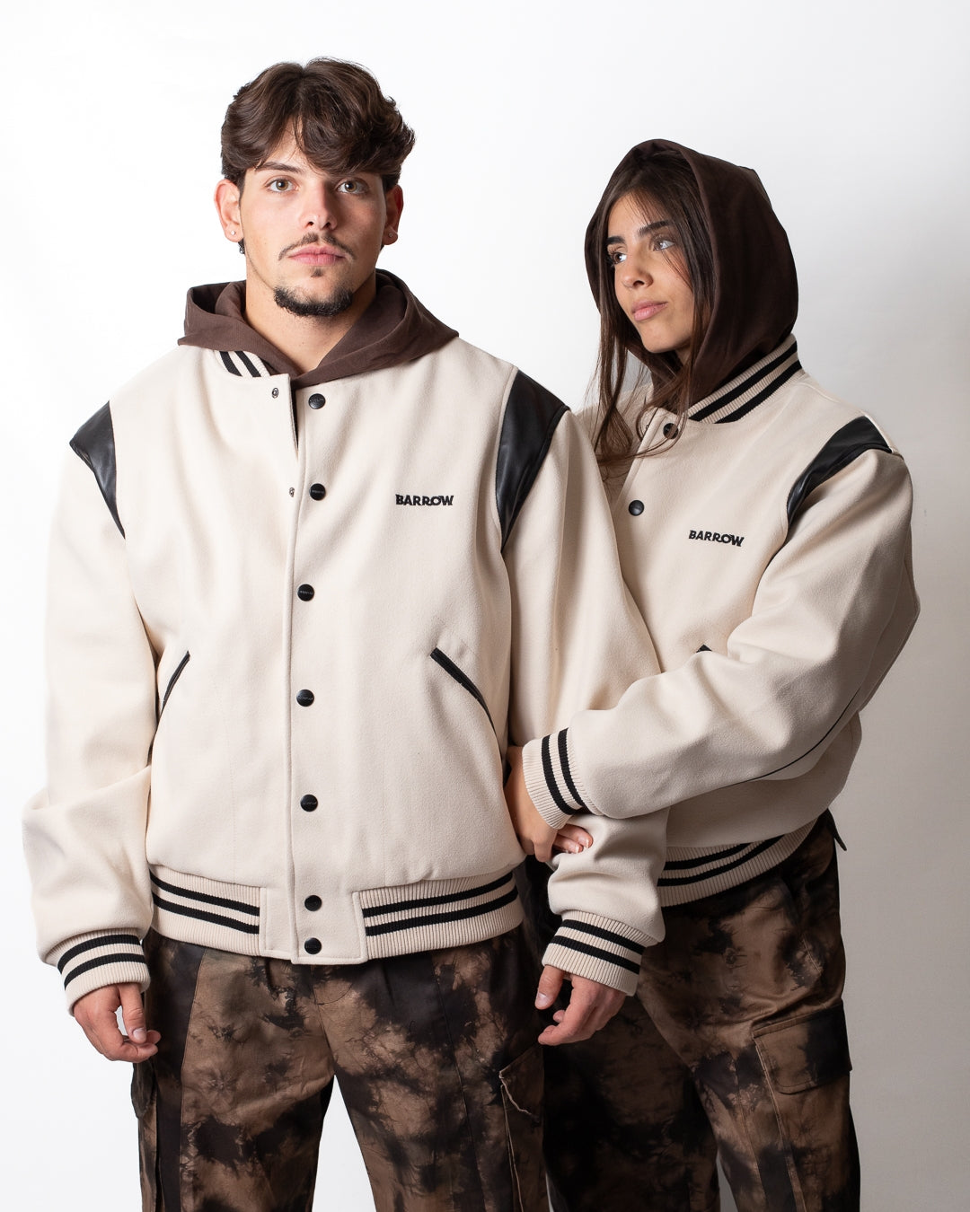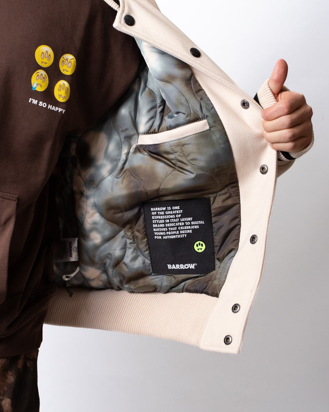 Giubbotto Barrow crema, unica variante. Design college jacket, girocollo, maniche lunghe, chiusura frontale con bottoni, tasche laterali, collo, polsini e fondo in costina, logo applicato su petto e schiena e ricamo Teddy applicato sul retro.