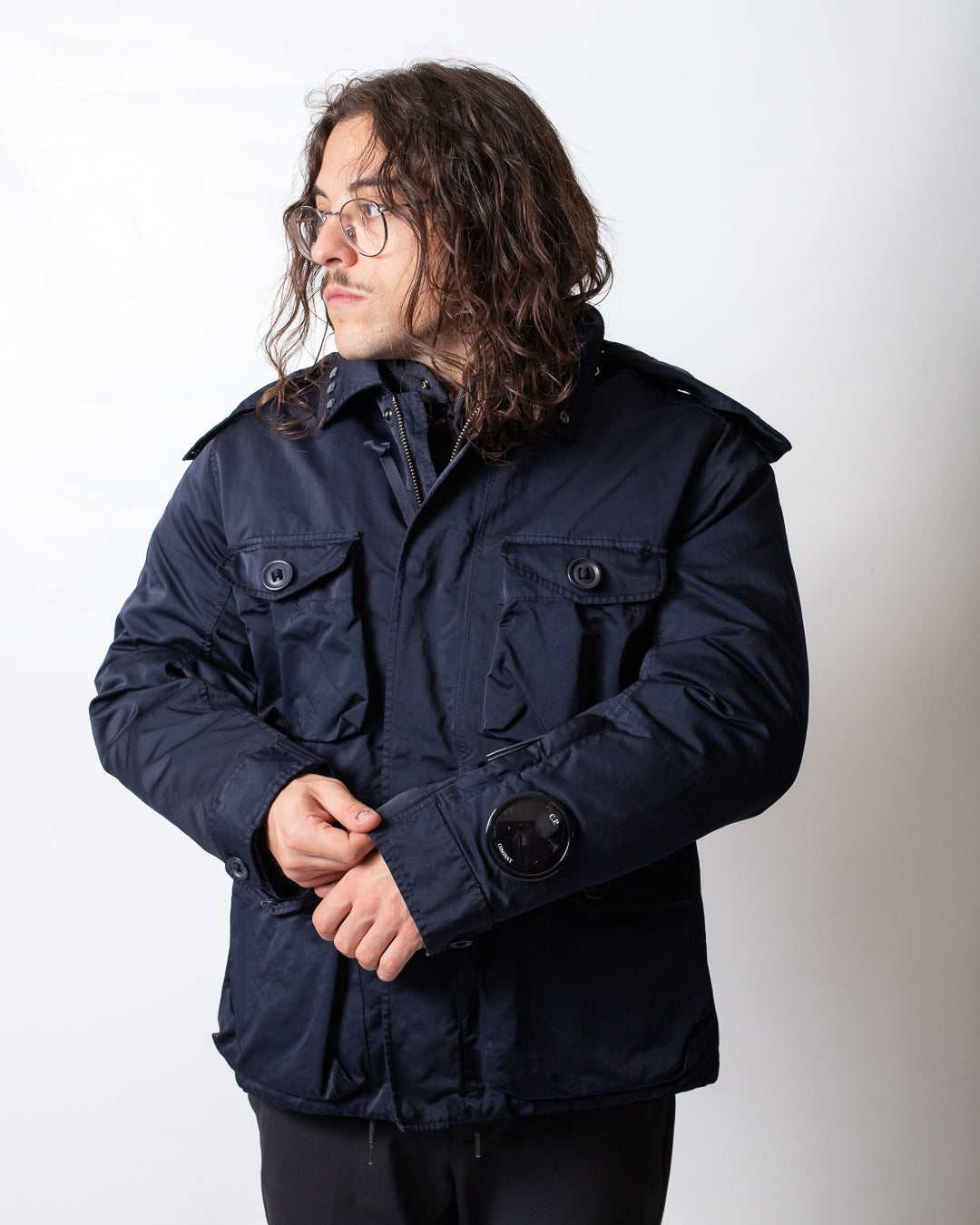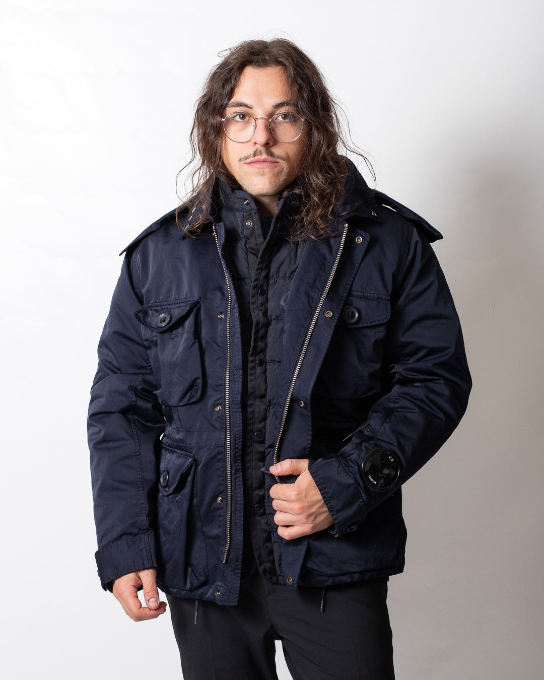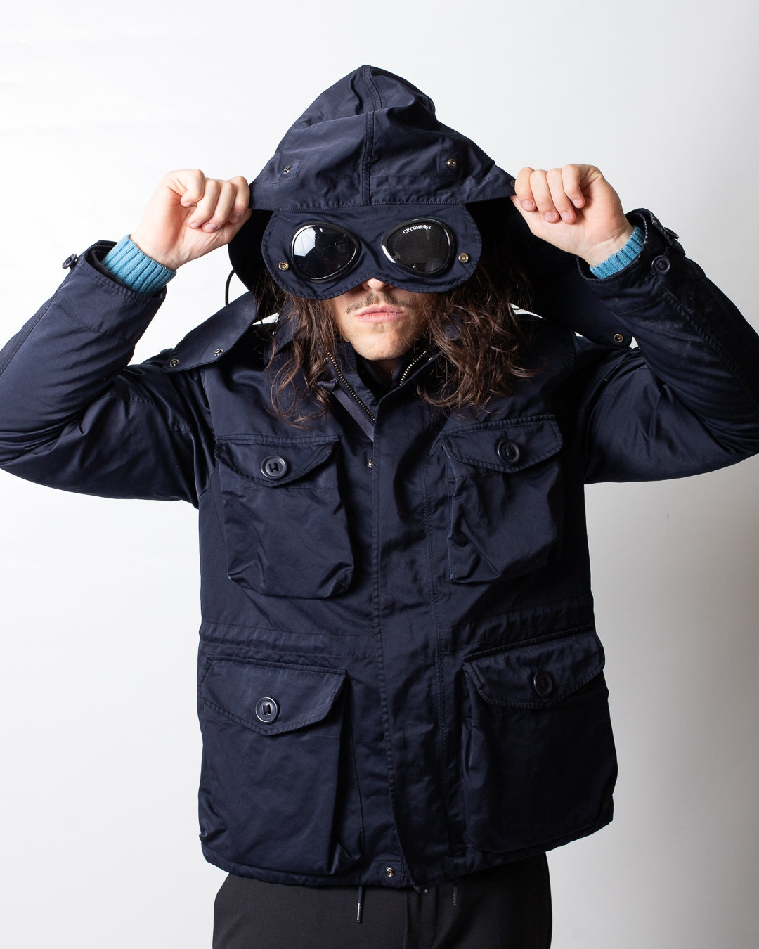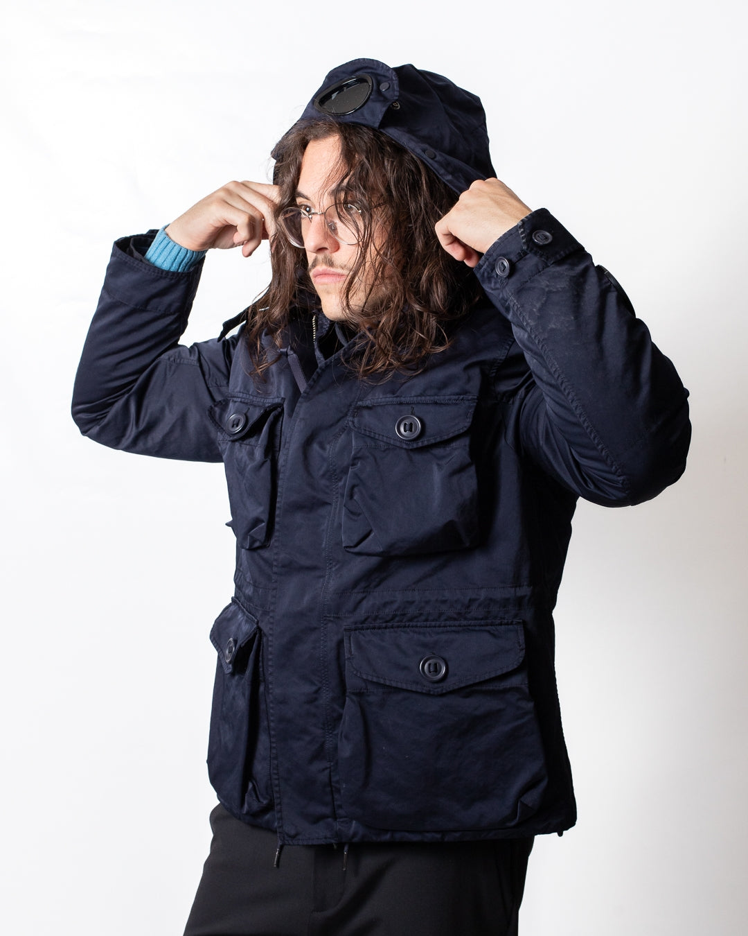 Giubbotto C.P. Company blu, unica variante. Design doppio tessuto, cappuccio con coulisse di regolazione removibile, lenti logate applicate sul cappuccio, bottoni sul colletto, chiusura frontale con zip e bottoni, maniche lunghe, tasche frontali con bottoni, bottoni sui polsini, coulisse di regolazione sul fondo e internamente, tasca con zip sulla manica e lente logata applicata sulla tasca.