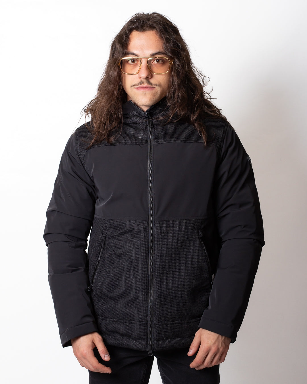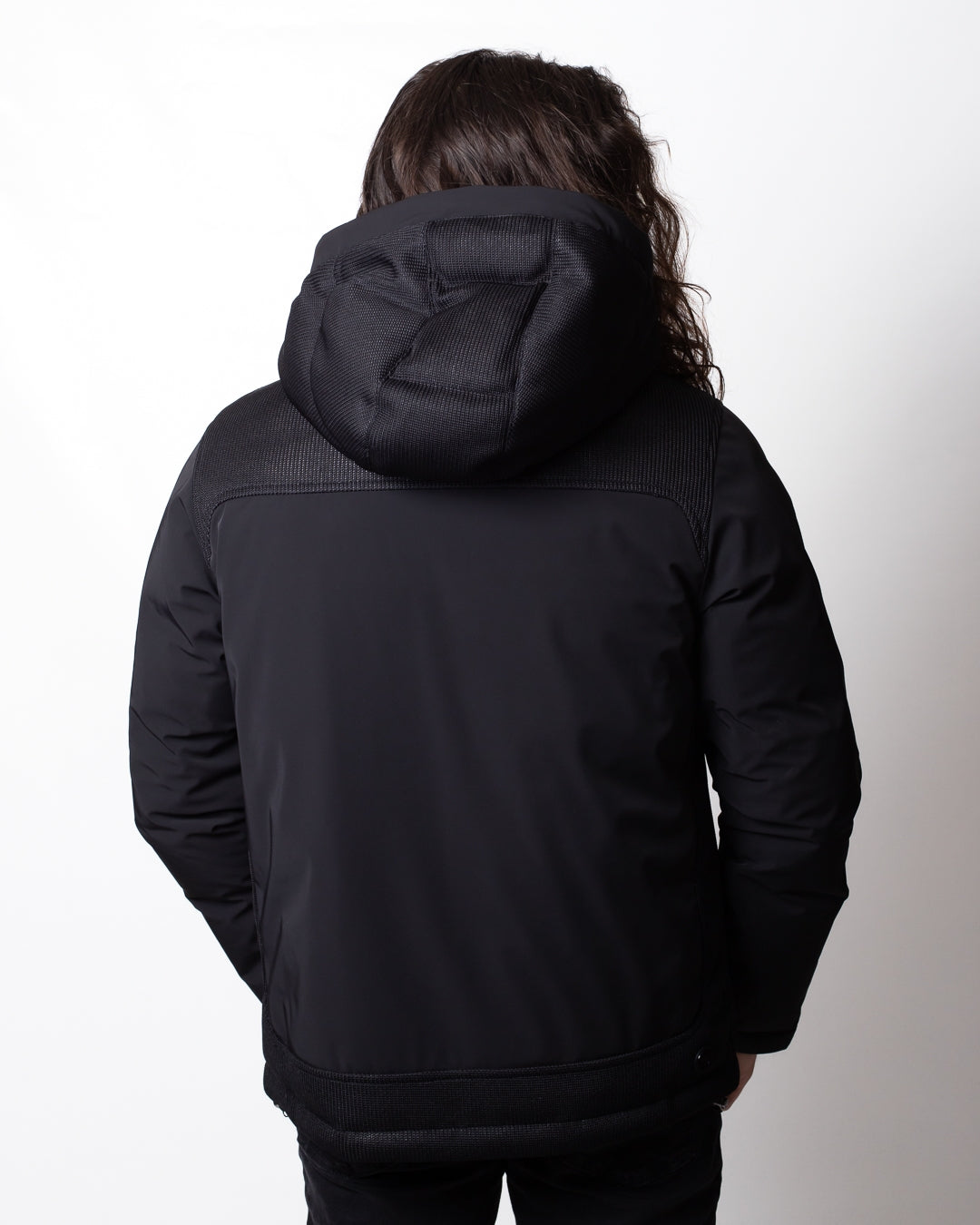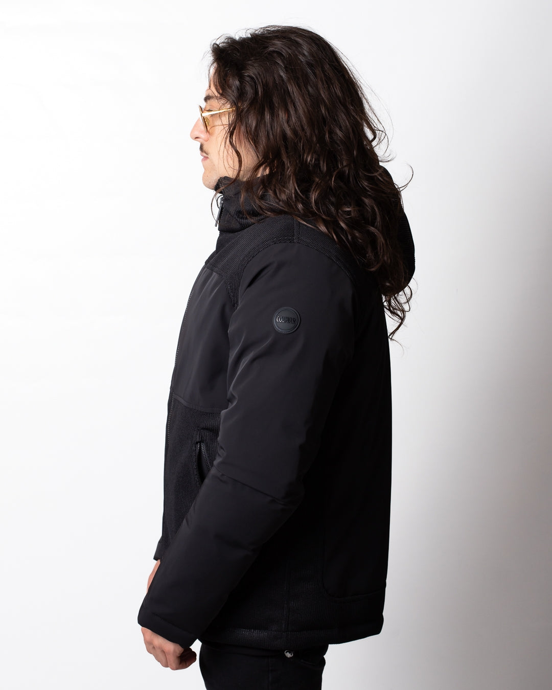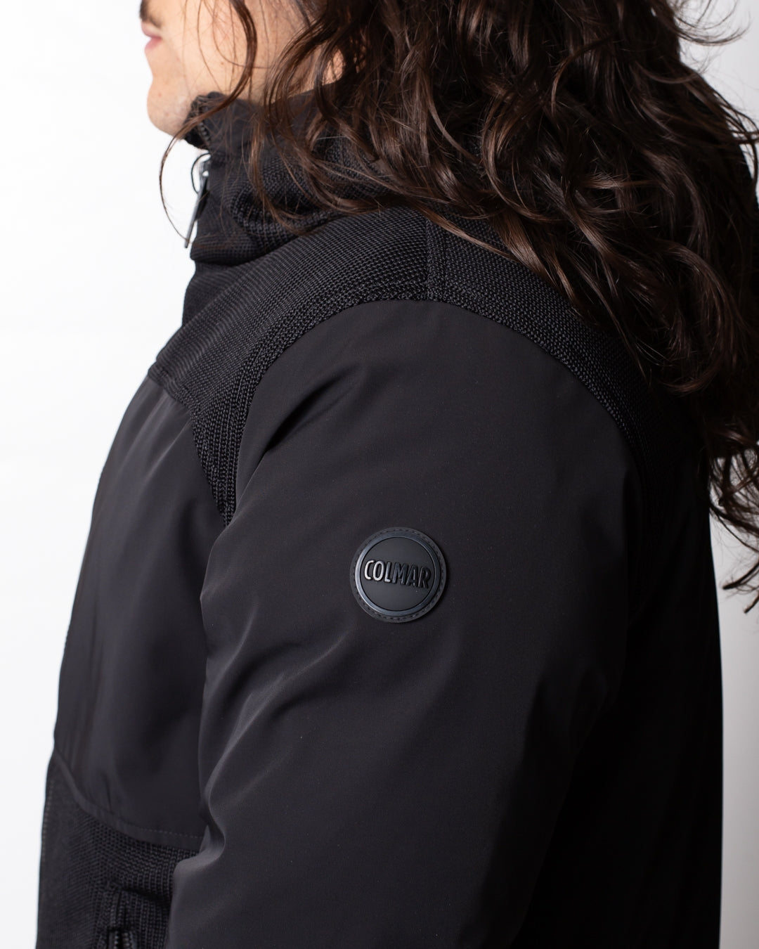 Giubbotto Colmar nero, unica variante. Cappuccio con coulisse di regolazione, maniche lunghe, chiusura frontale con zip, tasche laterali con zip, coulisse applicate sul fondo, dettagli in rete applicati frontalmente e sulla schiena e logo Colmar in silicone applicato tono su tono sulla manica sinistra e sul retro.