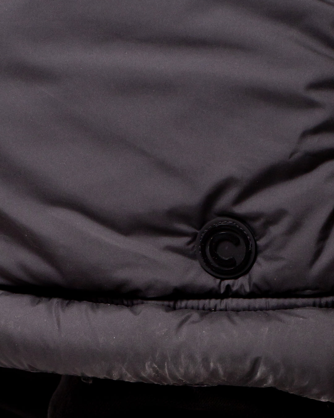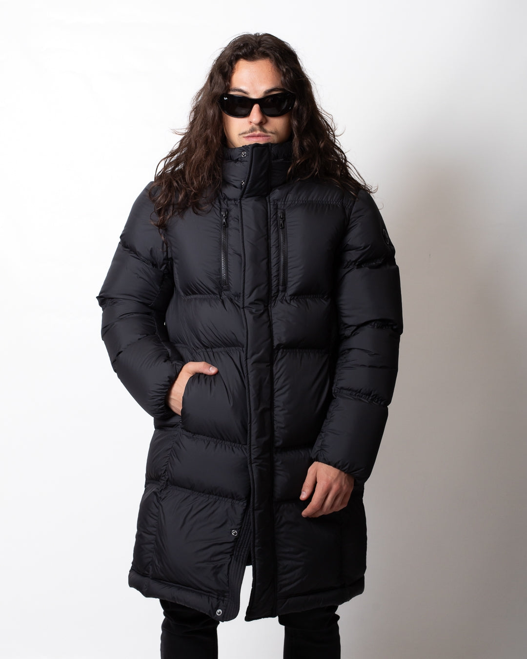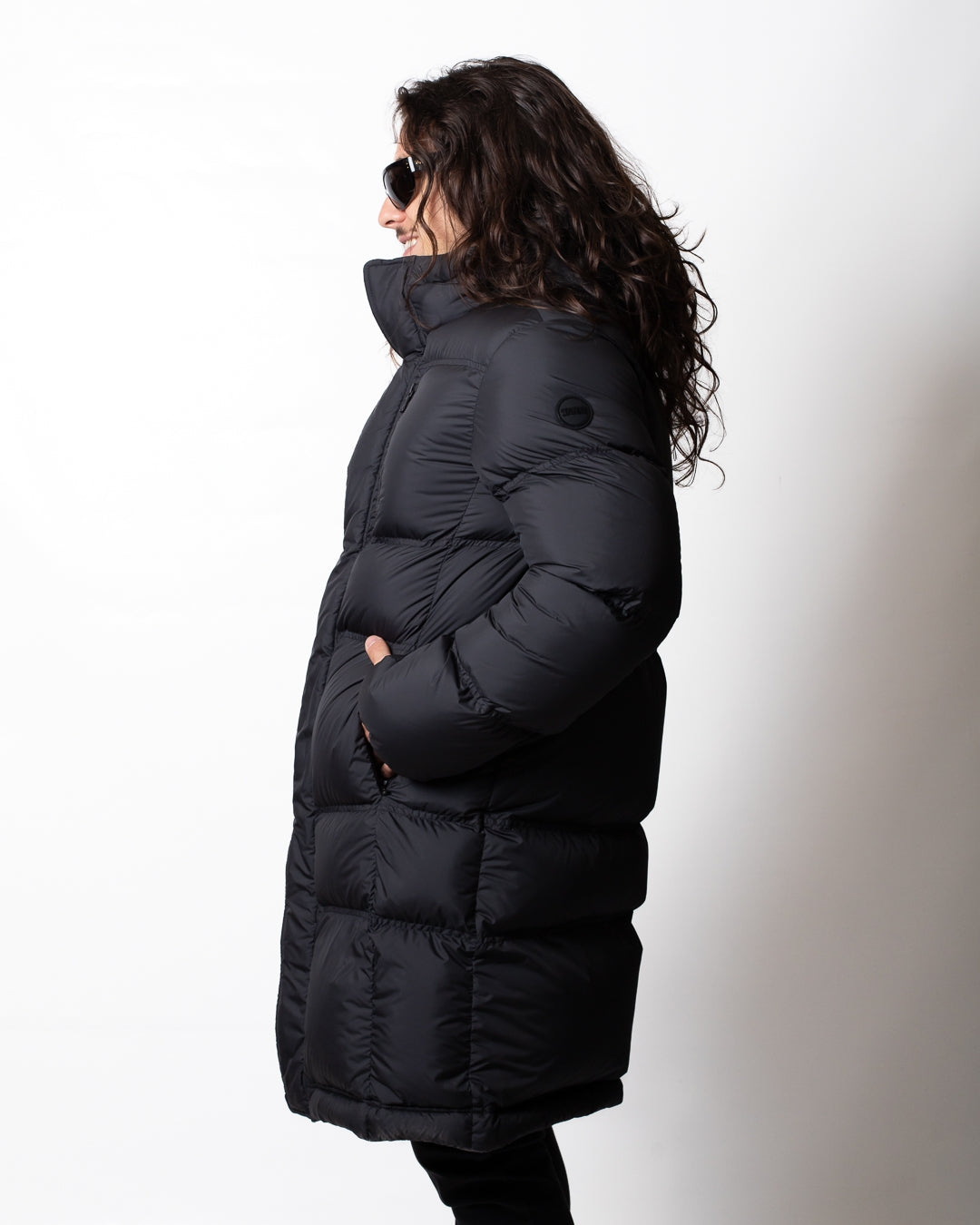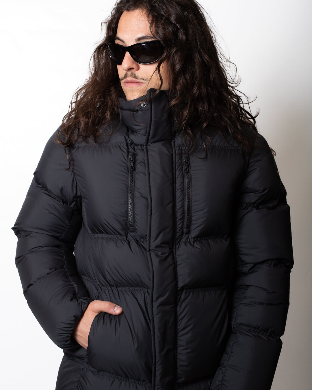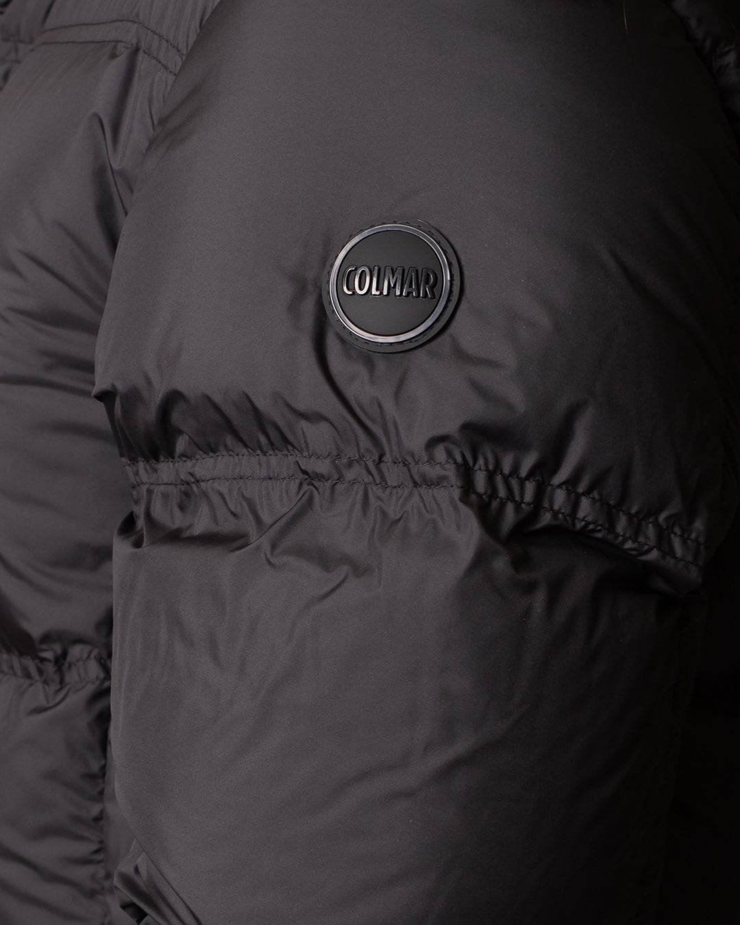 Giubbotto Colmar nero, unica variante. Design lungo, cappuccio con coulisse di regolazione, chiusura frontale con zip e bottoni, maniche lunghe, polsini elasticizzati, collo alto, tasche laterali con zip, tasche sul petto con zip e logo Colmar in silicone applicato tono su tono sulla manica sinistra e sul fondo.