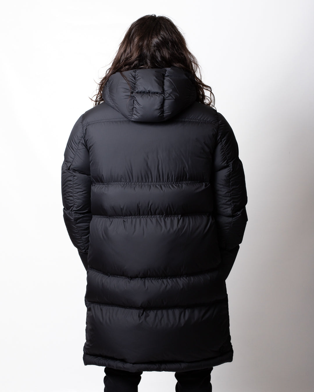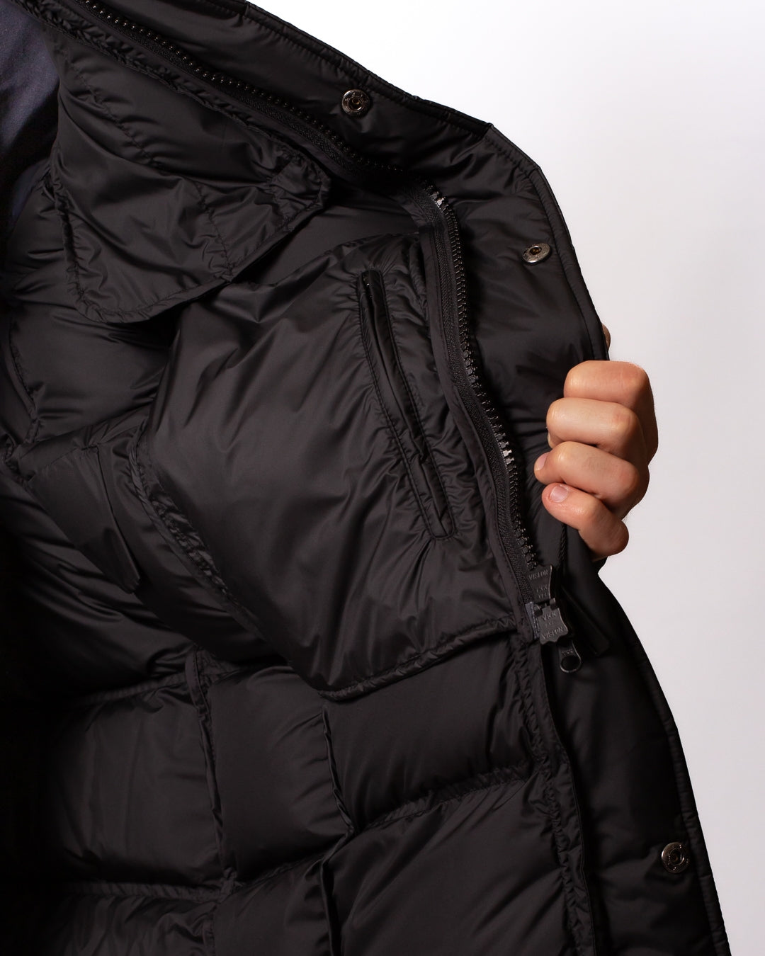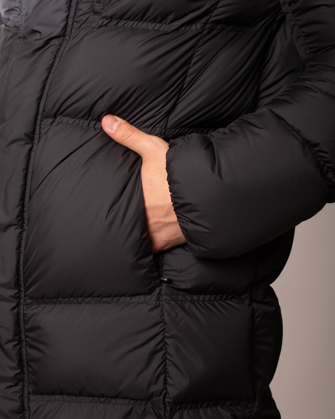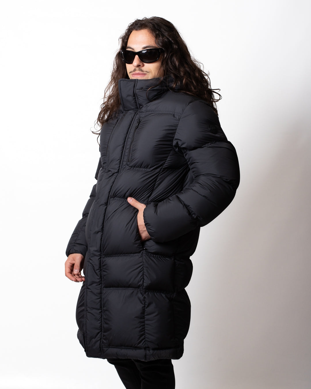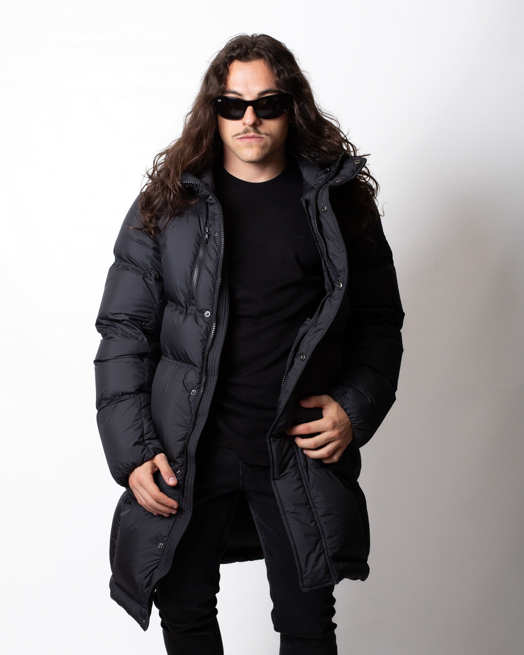 Giubbotto Colmar nero, unica variante. Design lungo, cappuccio con coulisse di regolazione, chiusura frontale con zip e bottoni, maniche lunghe, polsini elasticizzati, collo alto, tasche laterali con zip, tasche sul petto con zip e logo Colmar in silicone applicato tono su tono sulla manica sinistra e sul fondo.