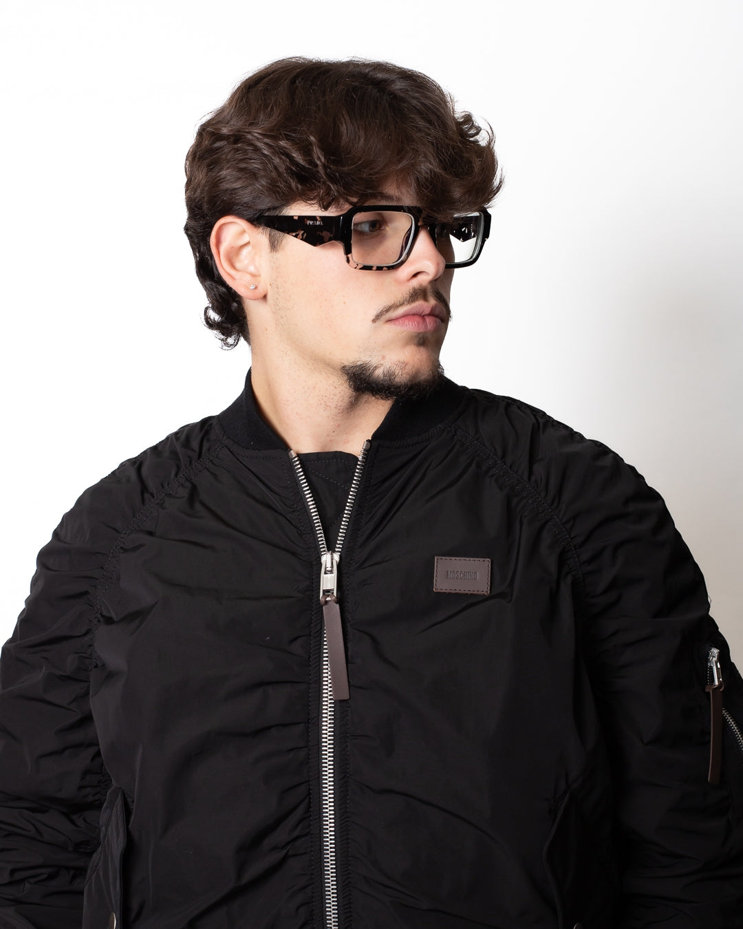 Giubbotto Moschino nero, unica variante. Modello bomber, girocollo in costina, chiusura frontale con zip, maniche lunghe, polsini e fondo elasticizzati in costina, tasche frontali con patta e bottone a pressione, tasca sulla manica con zip e patch in pelle con logo tono su tono applicata sul petto.