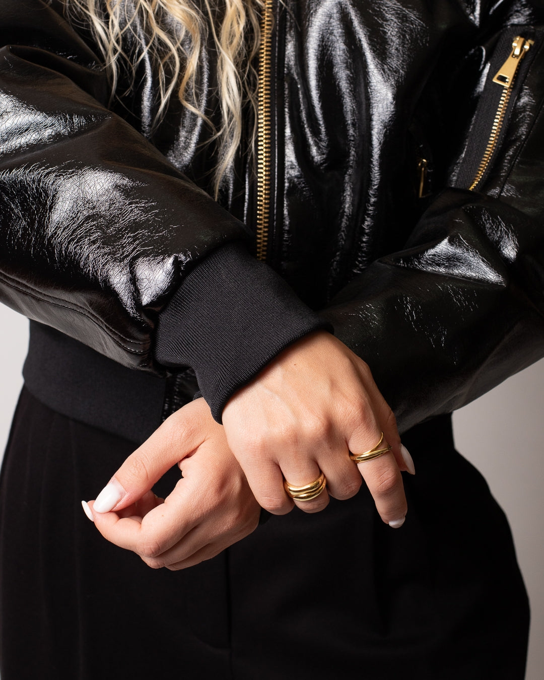Giubbotto Versace Jeans Couture nero, unica variante. Design in similpelle, girocollo, maniche lunghe, chiusura frontale con zip, tasche laterali con zip, polsini, fondo e collo in costina e tasca sulla manica con zip.