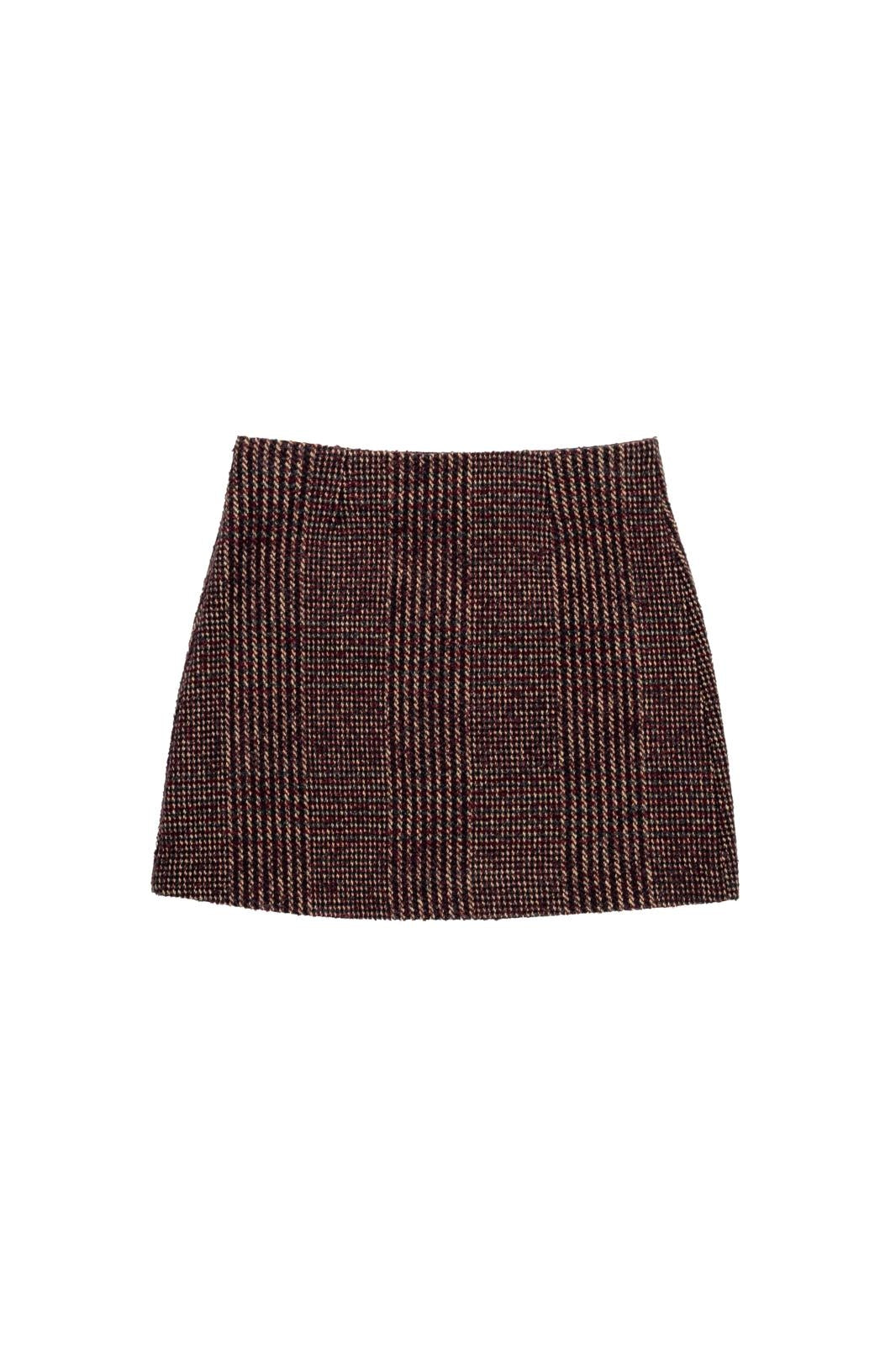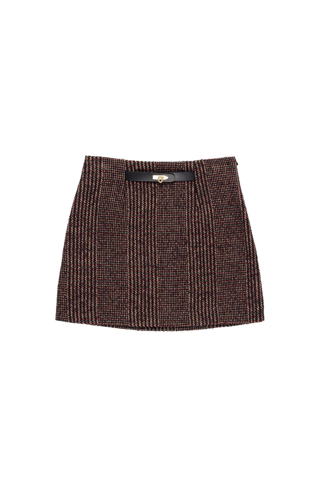 Gonna Nenette multicolor, unica variante. Texture in misto lana, chiusura laterale con zip e fibbia in pelle con gancio in metallo applicata in vita.