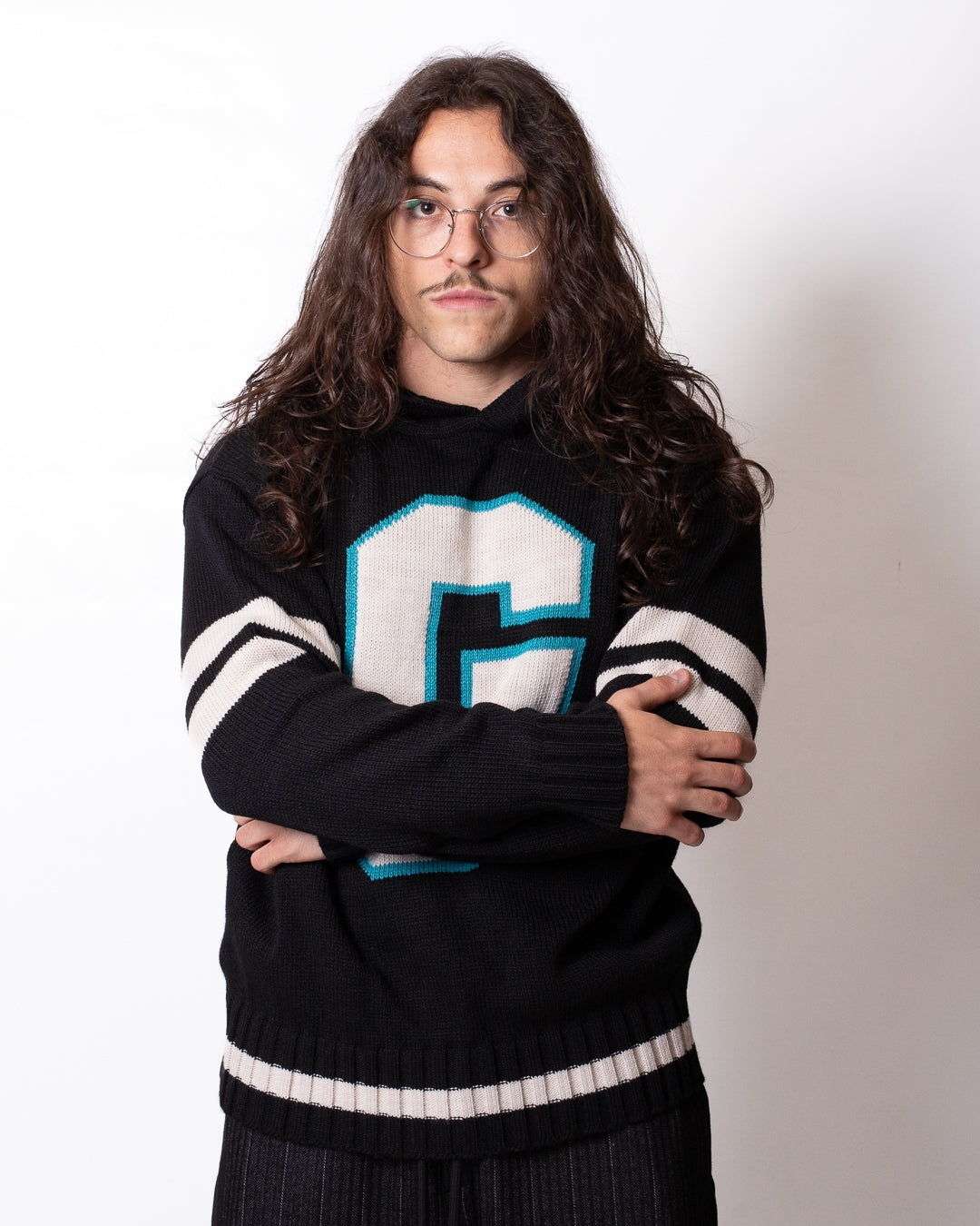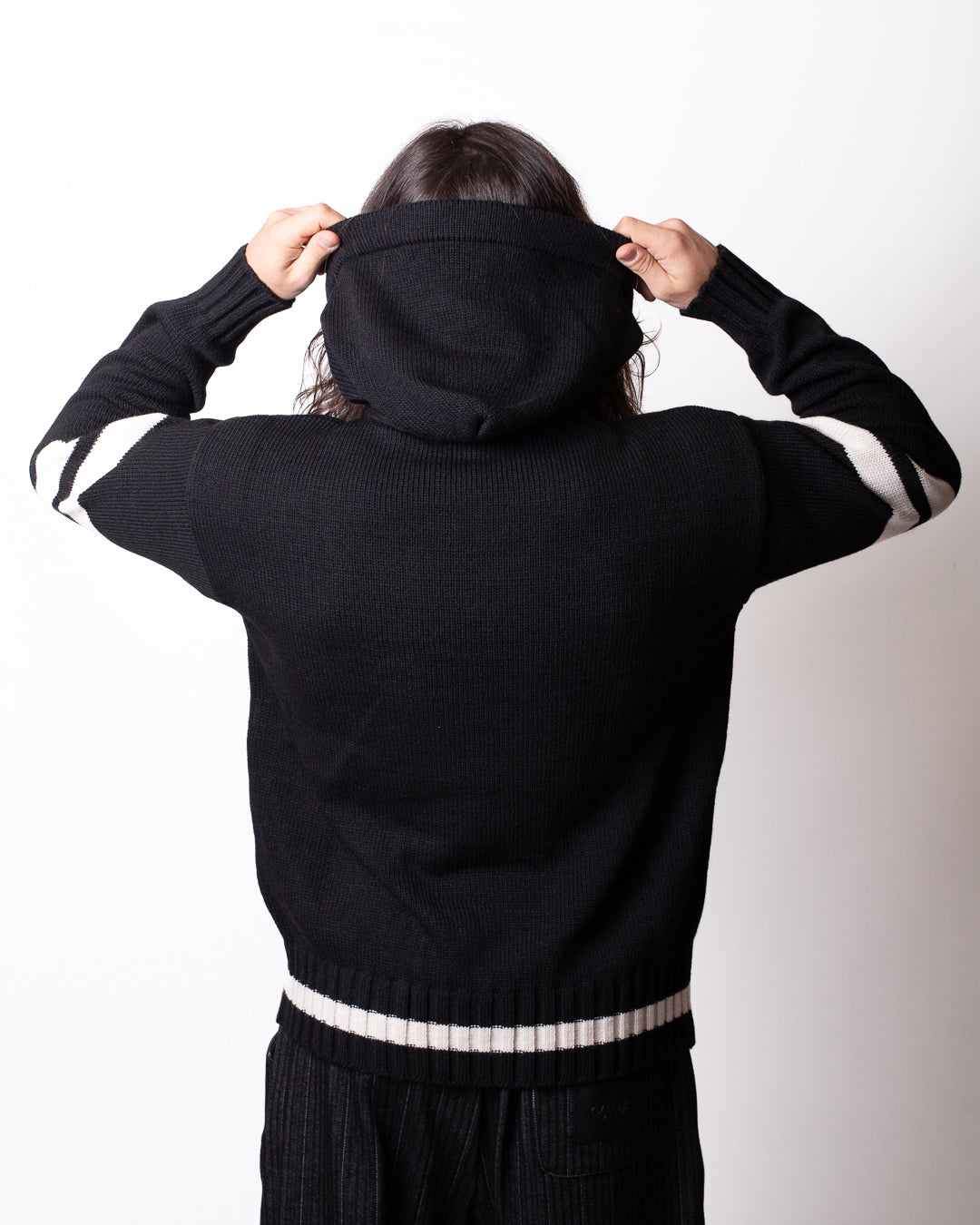 Maglia Gaelle nera, unica variante. Cappuccio, maniche lunghe, polsini e fondo in costina e intarsio logato applicato frontalmente.