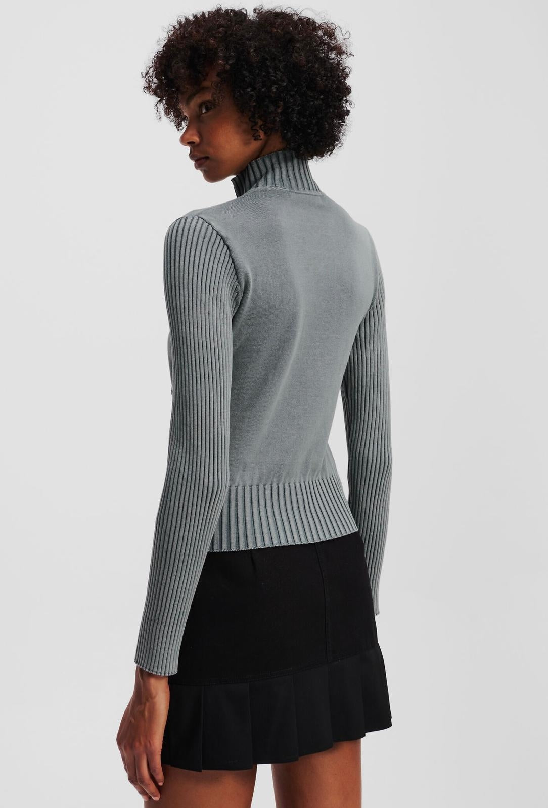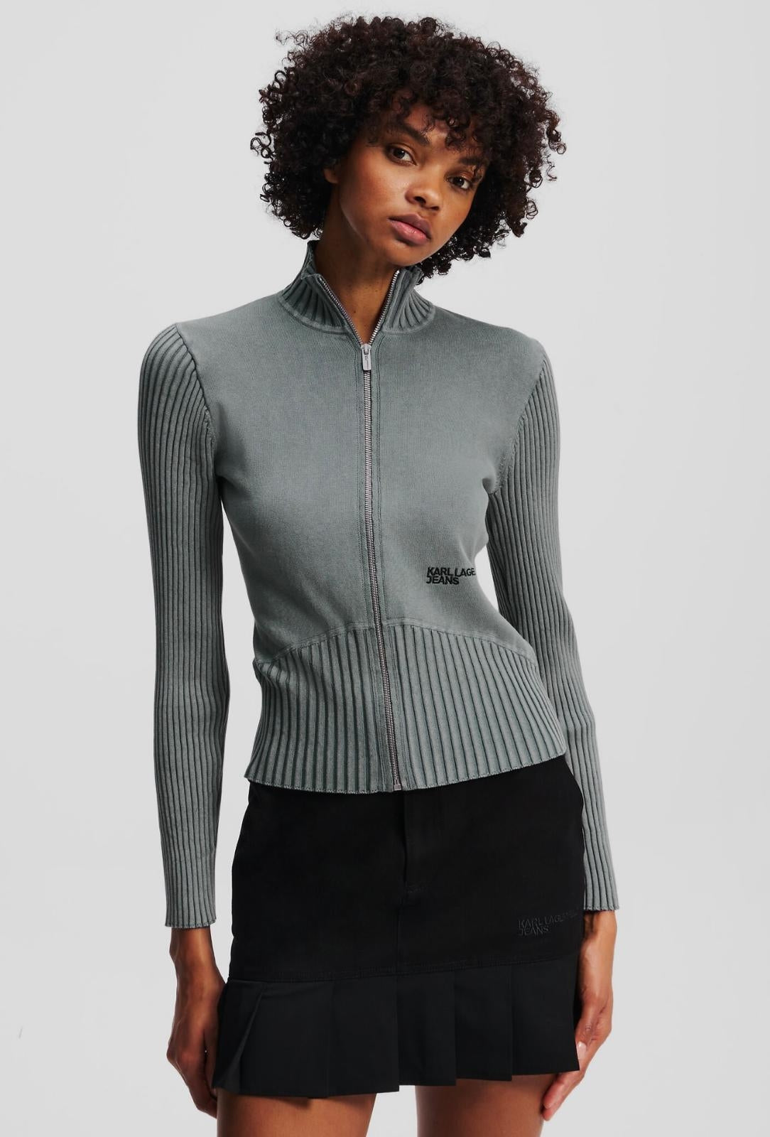 Maglia Karl Lagerfeld Jeans grigia, unica variante. Design fullzip, collo alto, maniche lunghe, collo, maniche e fondo in costina e logo ricamato a contrasto sul davanti.