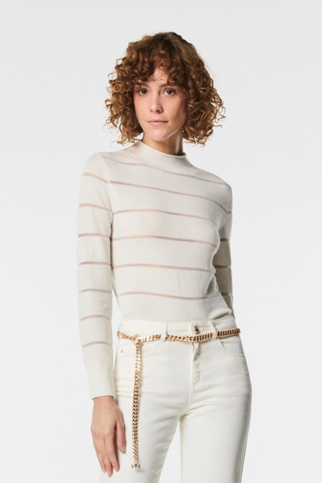 Maglia Nenette avorio, unica variante. Design lupetto, texture in misto lana, maniche lunghe, collo, fondo e polsini in costina e fantasia a strisce all-over.