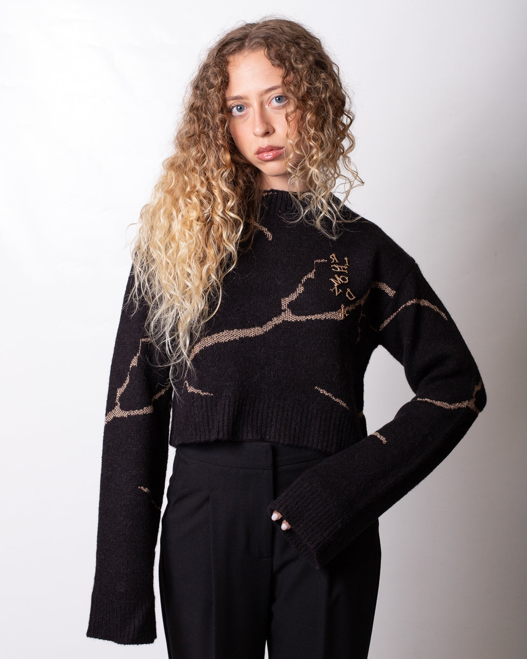 Maglia Richmnd X nera, unica variante. Girocollo, maniche lunghe, texture in misto lana, design cropped, collo, polsini e fondo in costina, ciondoli logati applicati frontalmente e placchetta in metallo logata applicata sul retro.